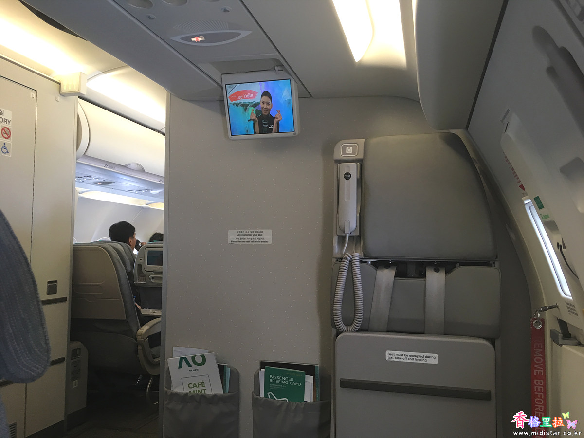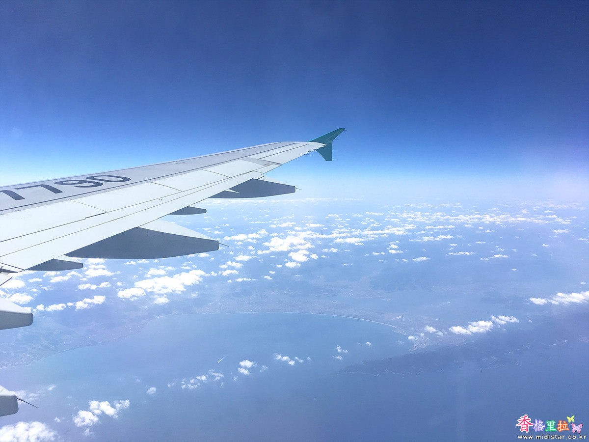 이륙 후 옮긴 옆자리 좌석은 앞에 의자가 없고 앞에는 이착륙 시 승무원이 앉는 좌석이라 발을 쭉 벋을 수 있어서 1시간 40분 정도의 비행이지만 아주 편안했다. 이 자리는 추가로 요금 내고 살만한 좌석이다. ​