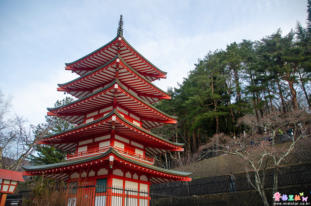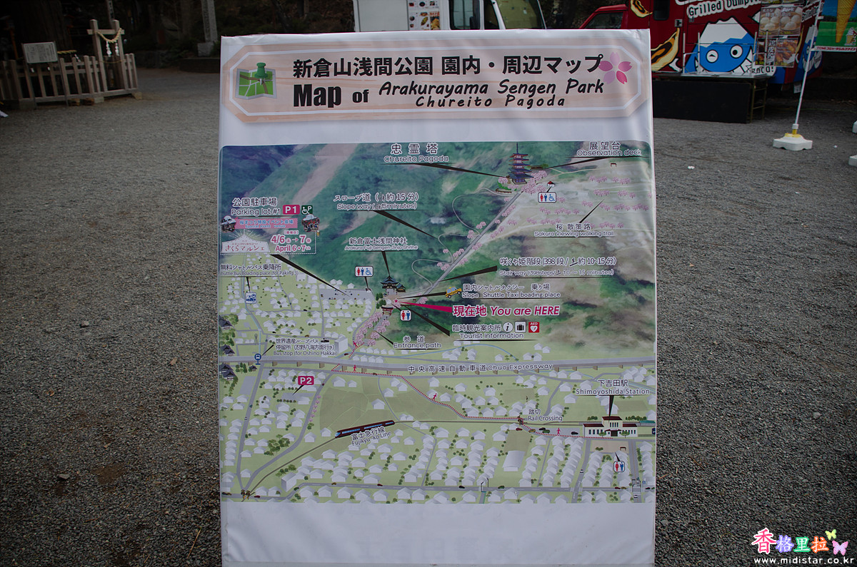 주차장 입구(오른쪽)로 나가면 아라쿠라후지센겐진자(新倉富士浅間神社)로 올라가는 길이다. 츄레이토(忠靈塔)는 신사(神社)에서 계단을 한참 올라가야 한다.