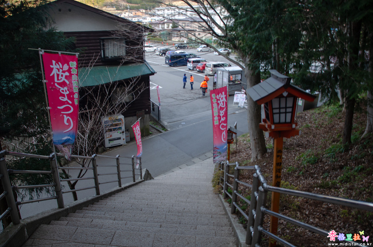 주차장 앞부터 바로 아라쿠라후지센겐진자(新倉富士浅間神社) 계단이 시작된다.