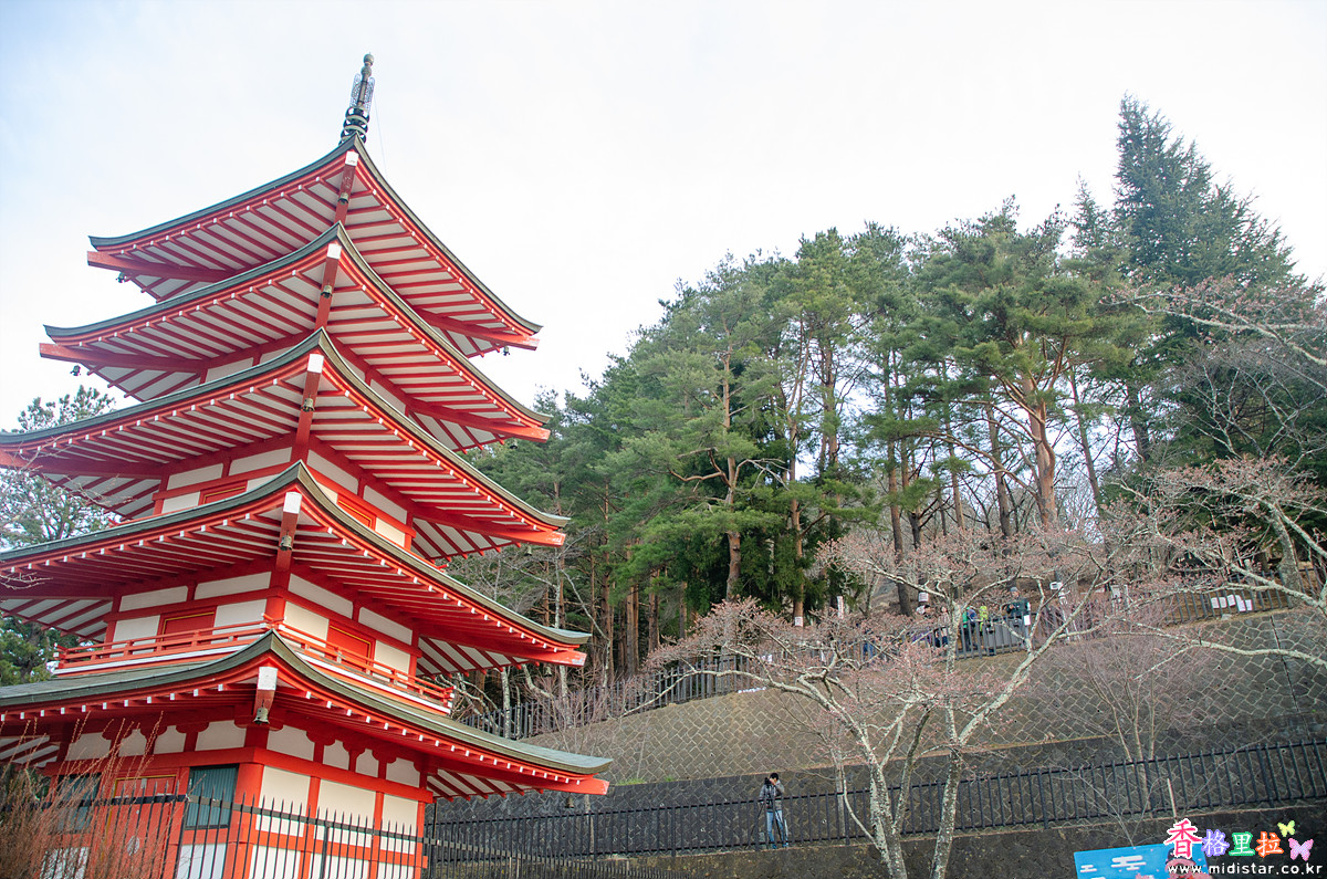 주차장 입구(오른쪽)로 나가면 아라쿠라후지센겐진자(新倉富士浅間神社)로 올라가는 길이다. 츄레이토(忠靈塔)는 신사(神社)에서 계단을 한참 올라가야 한다.