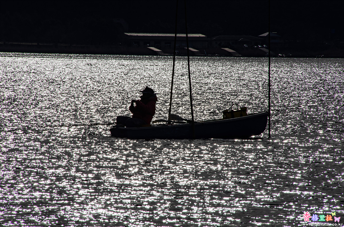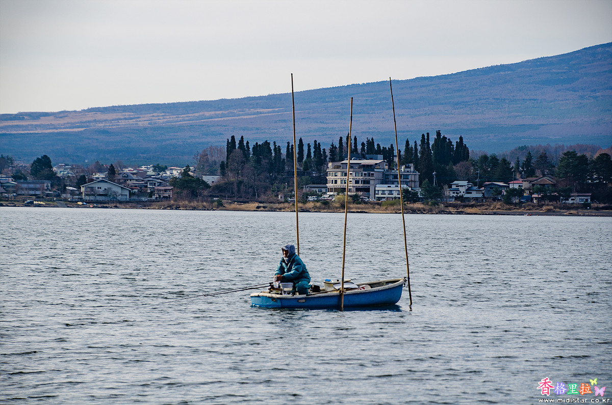 후지산을 배경으로 배에서 한가롭게 낚시를 하는 풍경이 한폭의 그림이다.