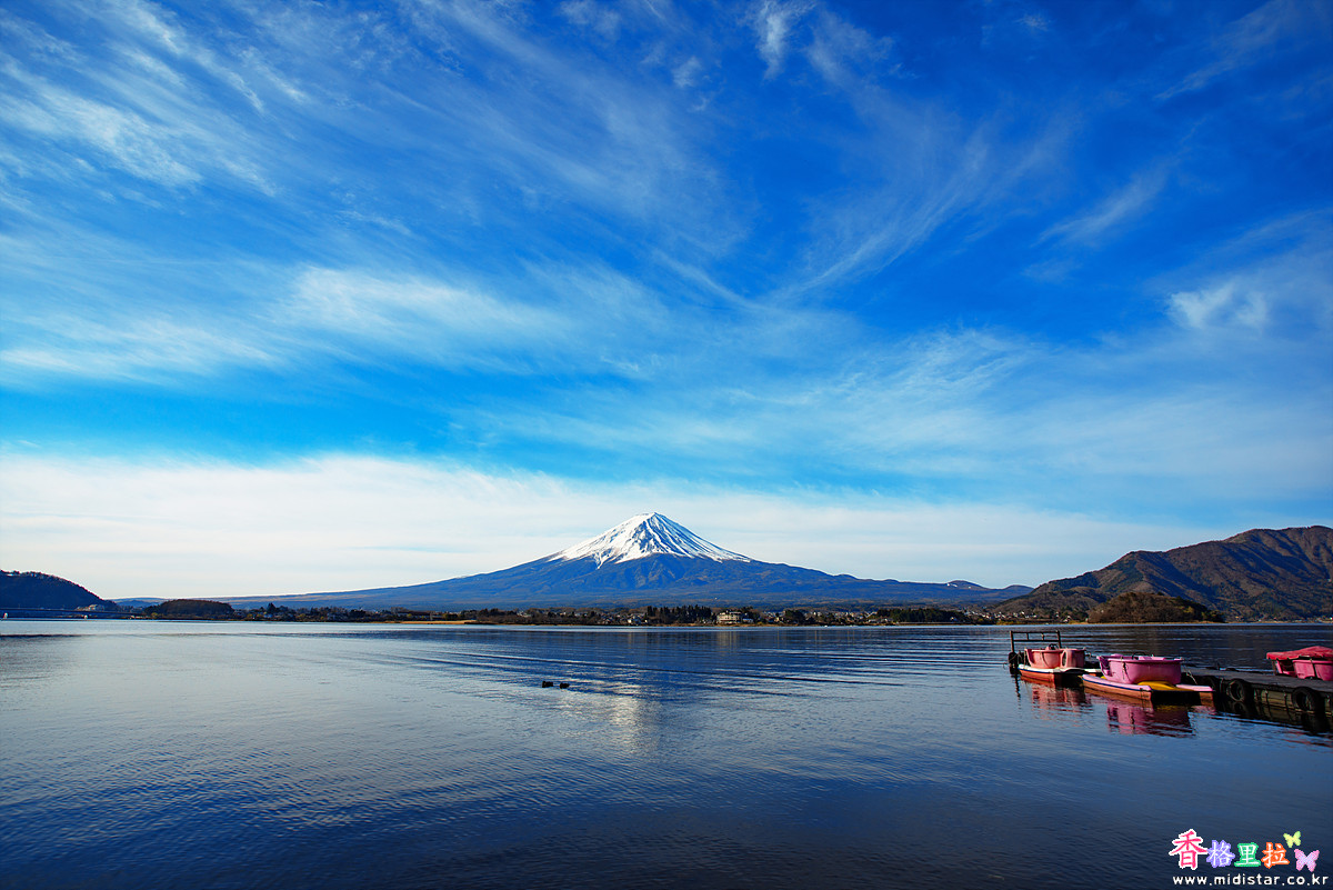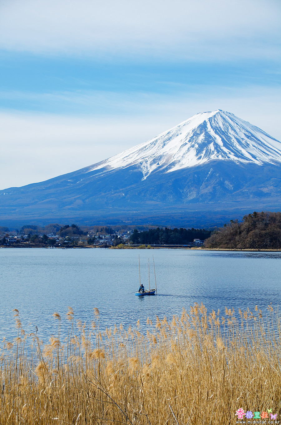 후지산을 배경으로 배에서 한가롭게 낚시를 하는 풍경이 한폭의 그림이다.