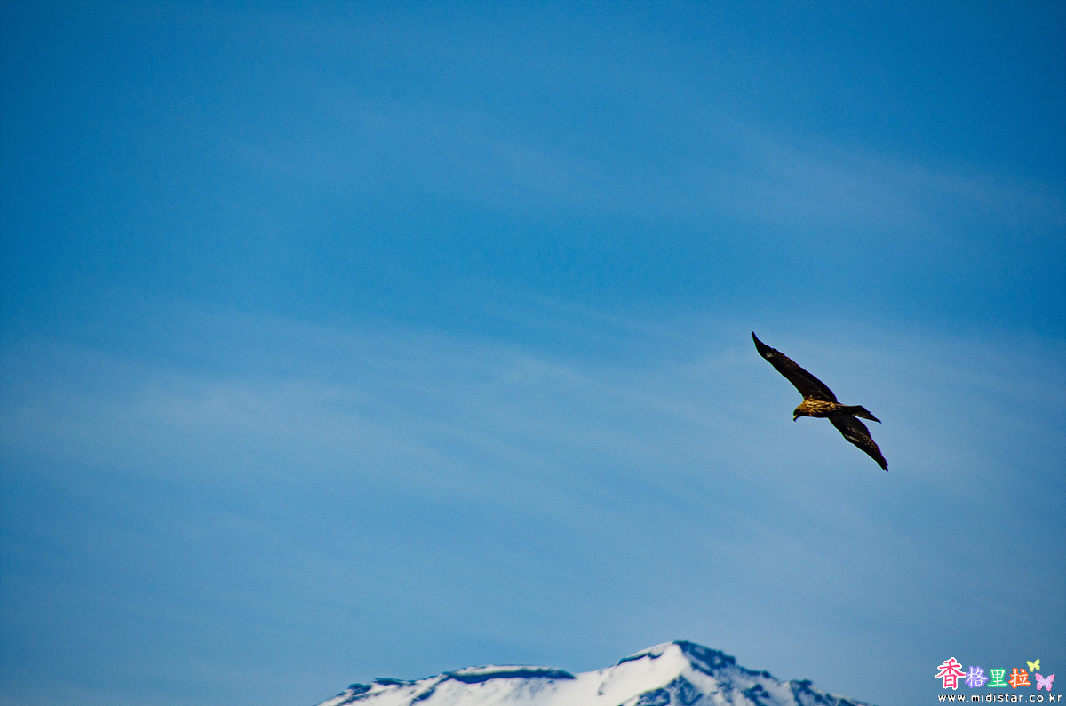 매 한 마리가 가와구찌고(河口湖) 위를 서서히 날며 사냥감을 물색하고 있다.