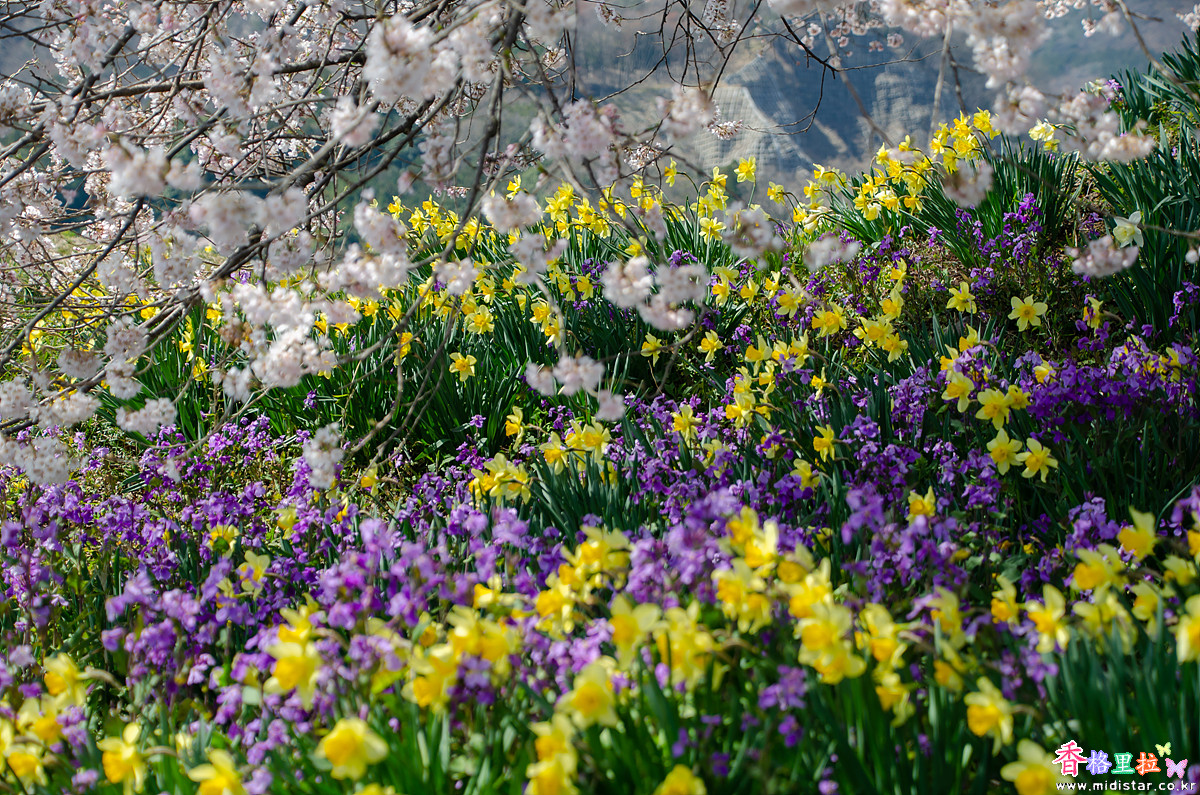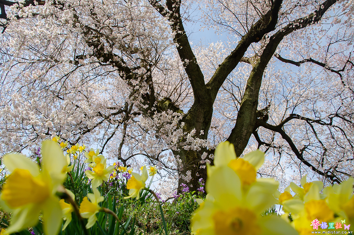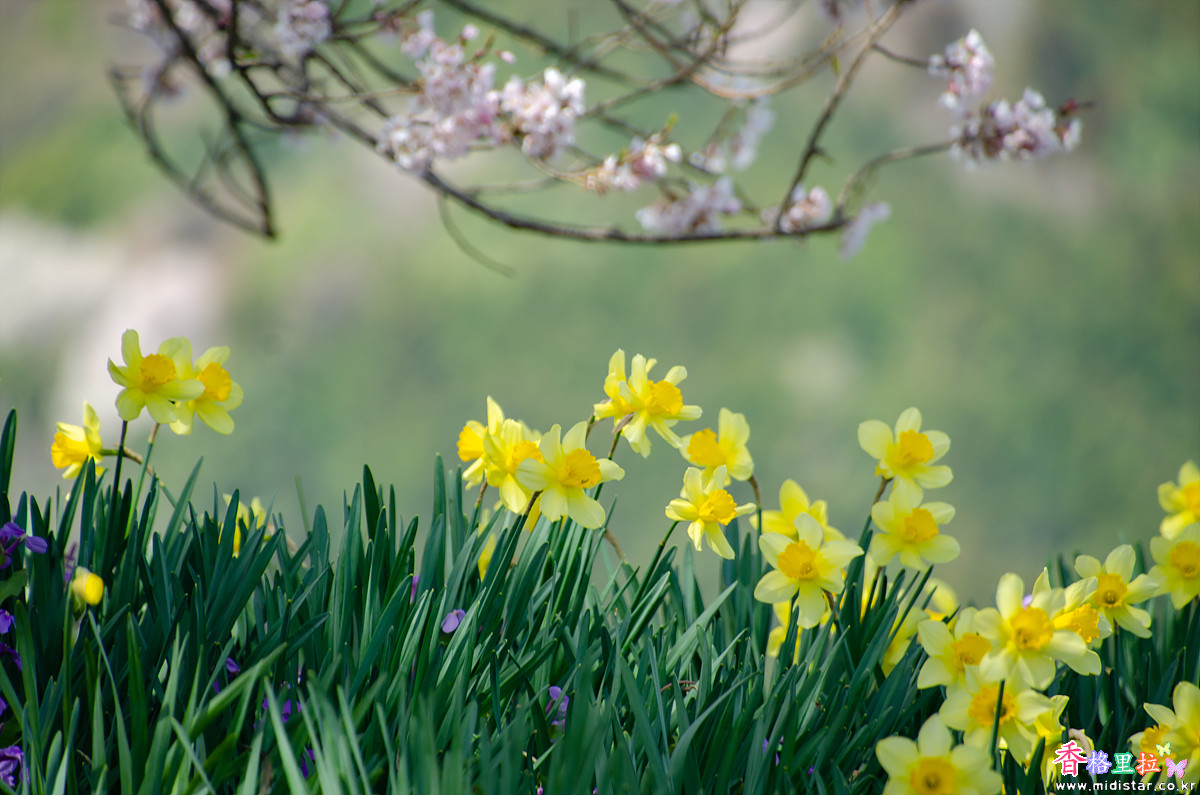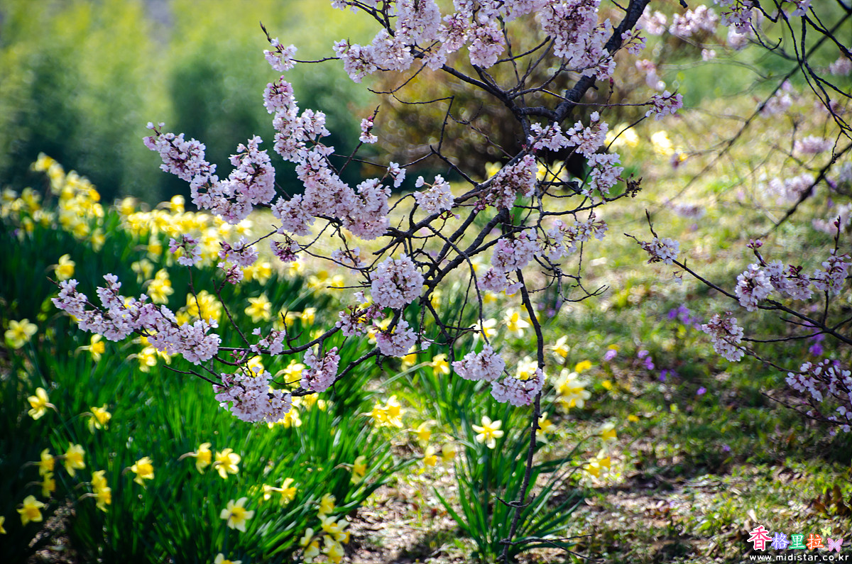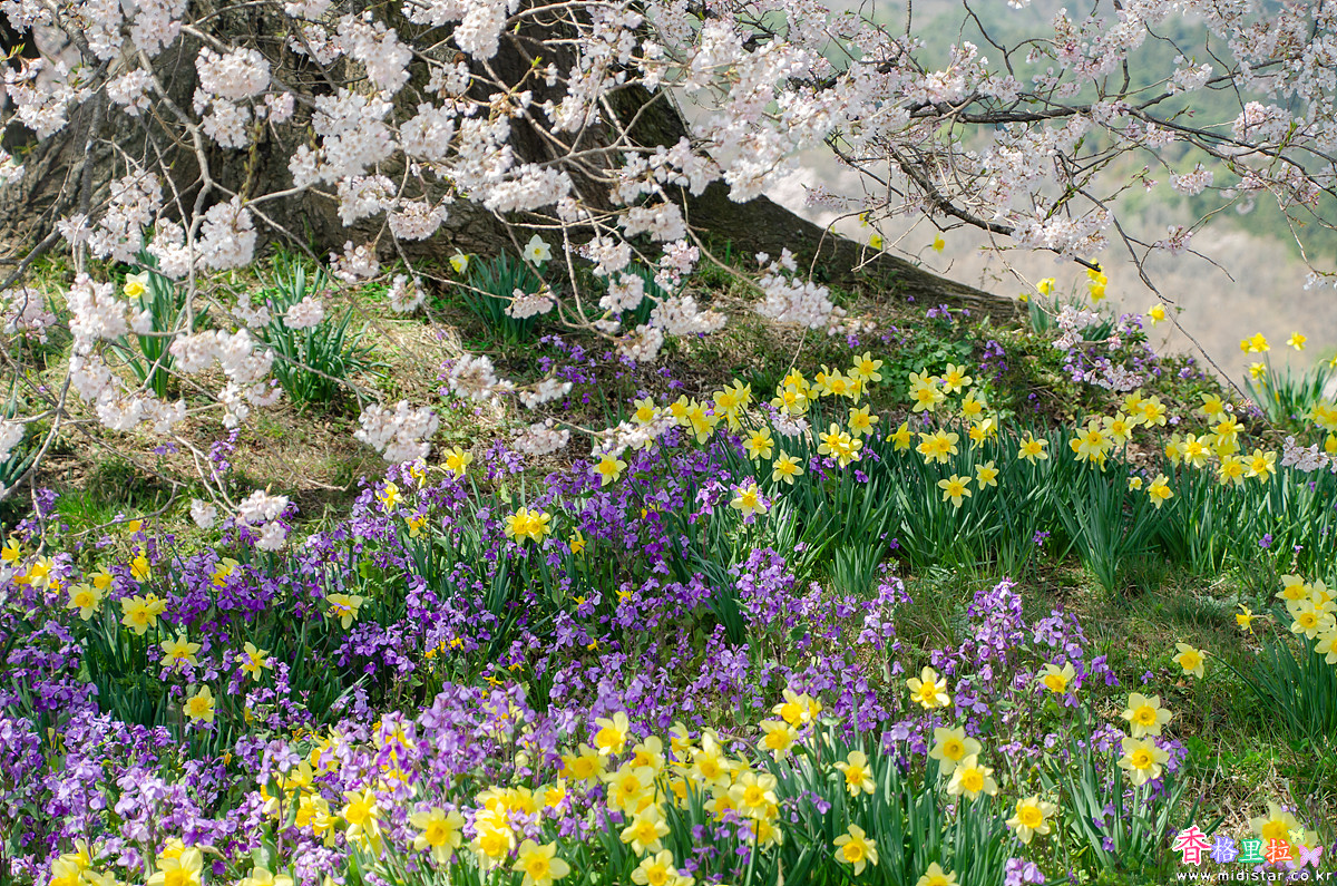 벚나무 아래에는 수선화가 노랗게 꽃을 피우고 있다.