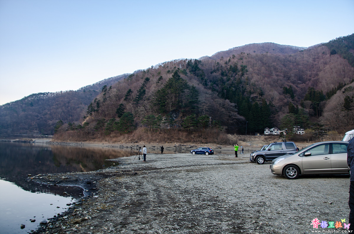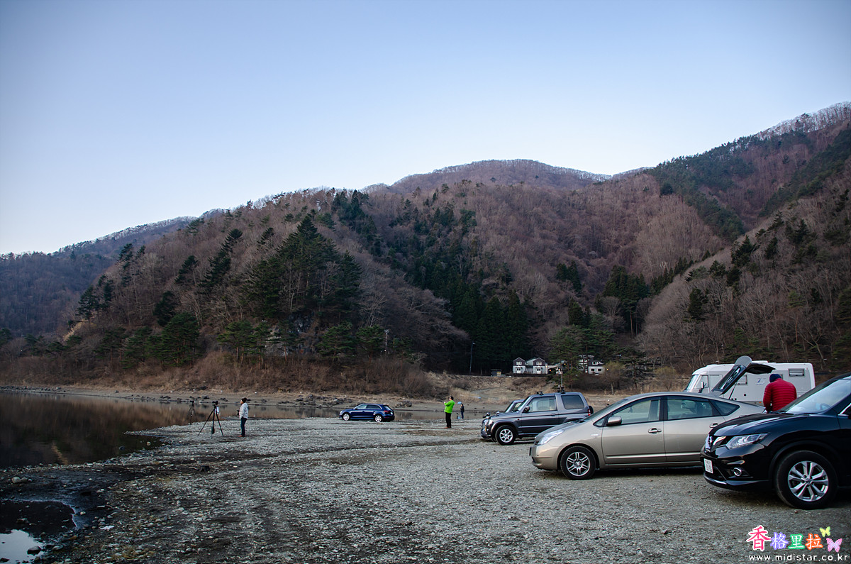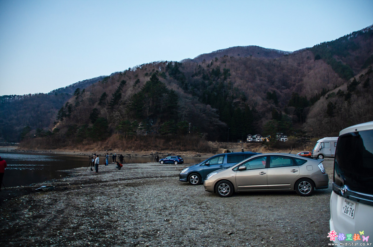 쇼지고(精進湖) 앞의 주차장에 차를 세우고 호수변으로 내려가니 호수 주변까지 차로 들어갈 수 있었다. 한국과는 다른 분위기이다. 아마 한국이라면 이렇게 차를 호수 주변에 주차하지 못하도록 막아놓았을 거 같다.