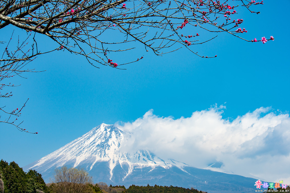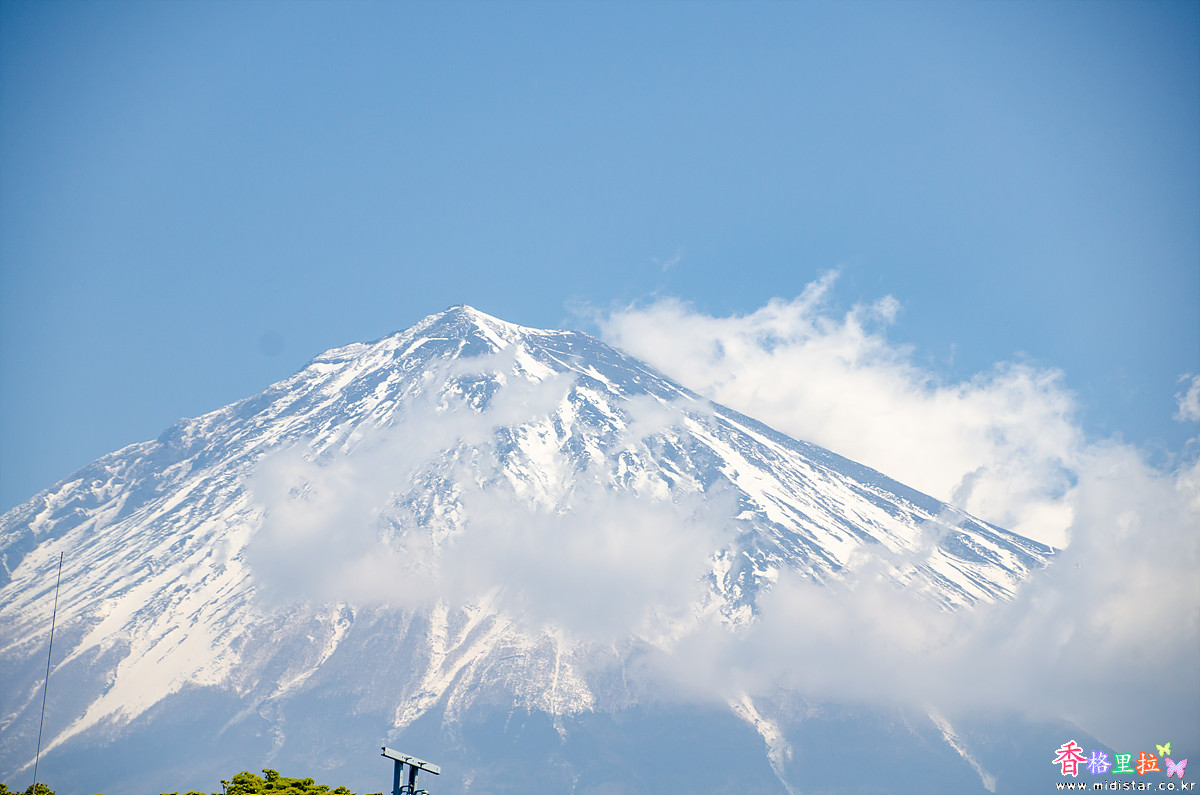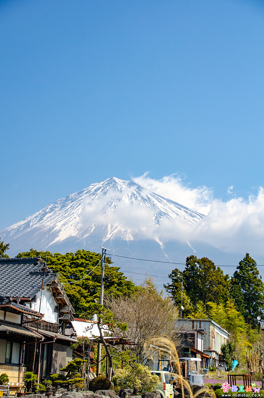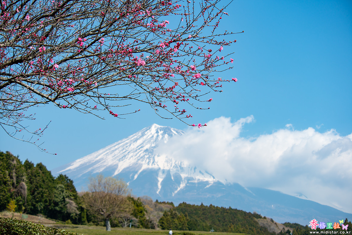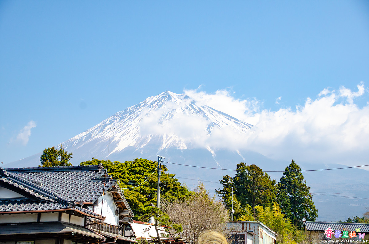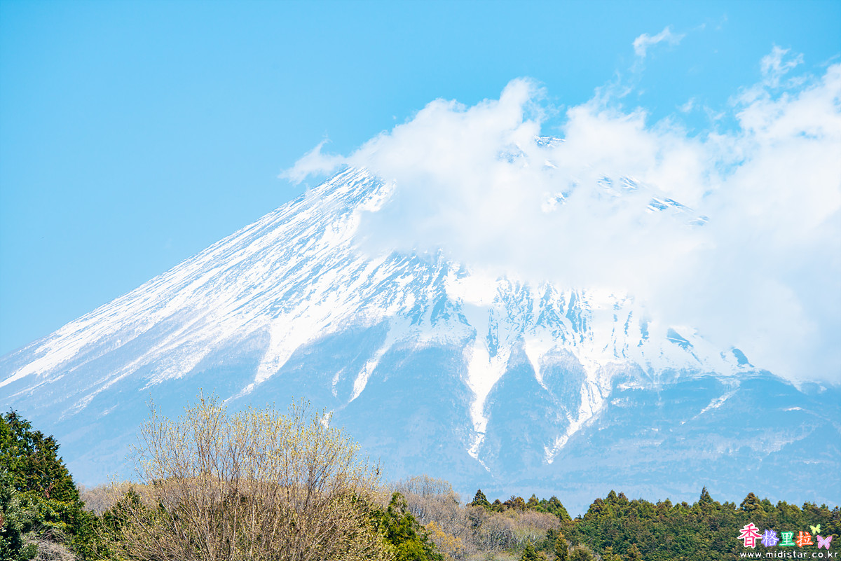 카리야도노시모우마사쿠라(狩宿の下馬桜)를 떠나 길을 달리다가 파란 하늘을 배경으로 후지산에 구름이 살짝 걸려있는 멋진 풍경을 보고 차를 세워 후지산을  한 장 찍었다.