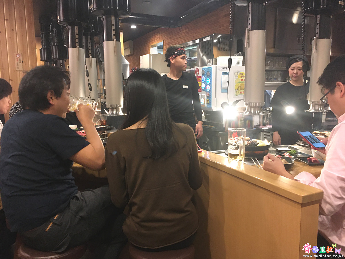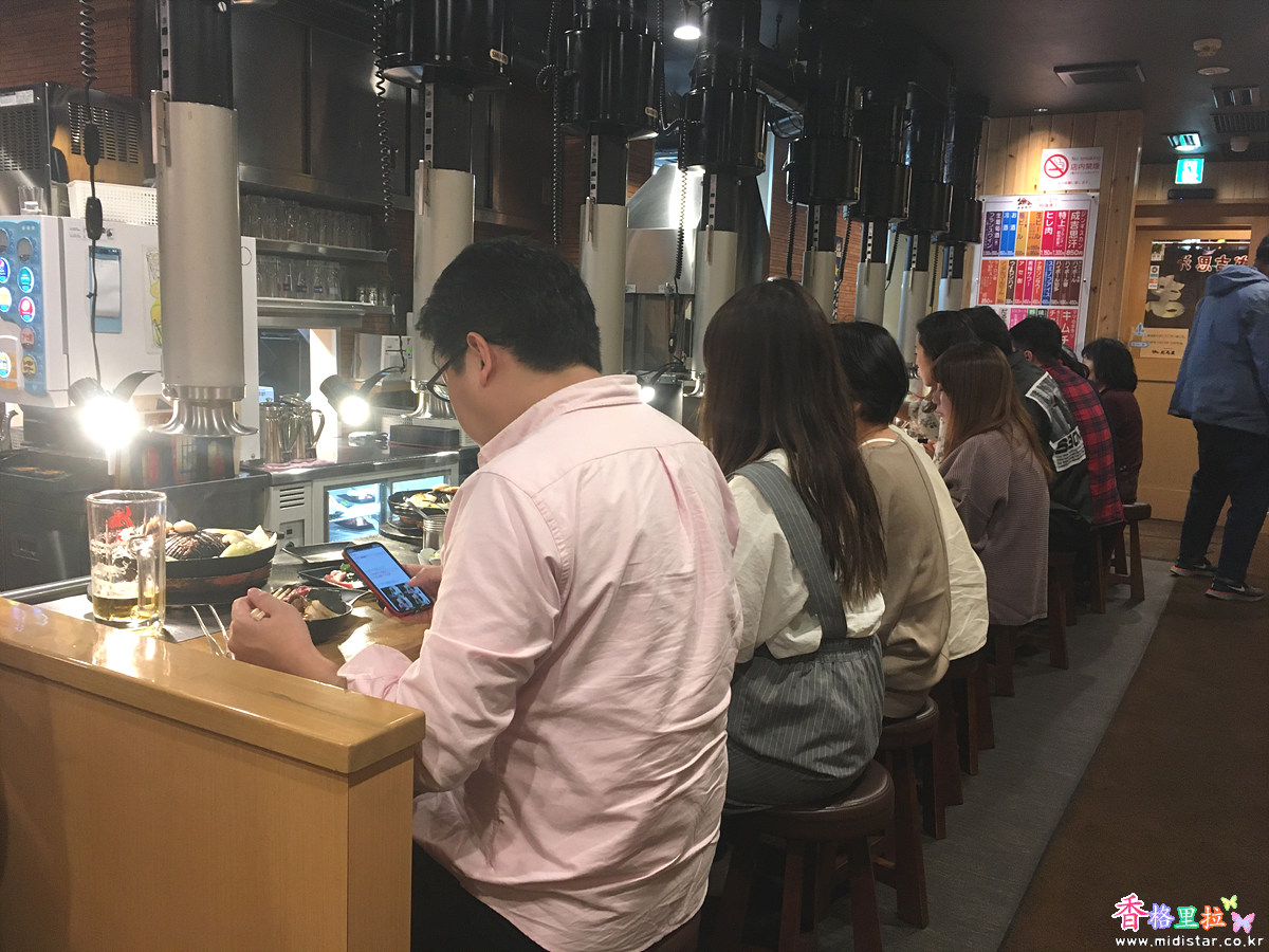 식당안에 들어서니 한 박자 늦게 도착했는지 테이블에는 한참 고기를 굽고 있고 'ㄴ' 자 대기의자엔 사람들이 죽 앉아서 대기를 하고 있었다. 고기를 구워먹는 시스템이라 한바퀴 회전하는 시간이 조금 긴편이다. 그래도 기다려서 먹는데 익숙한 일본 사람들이라 그런지 기다려서 먹고야 만다.