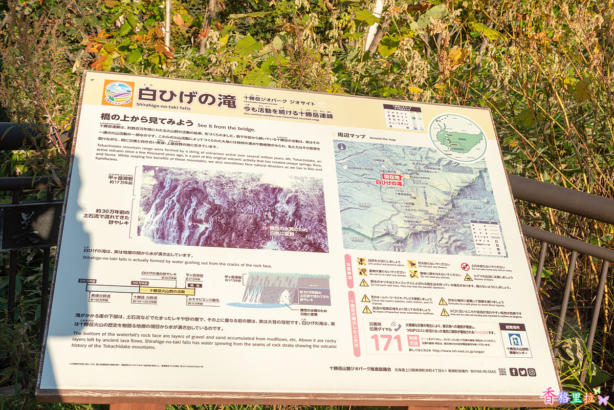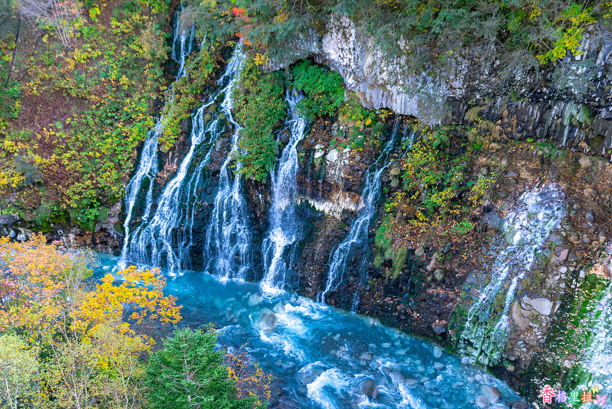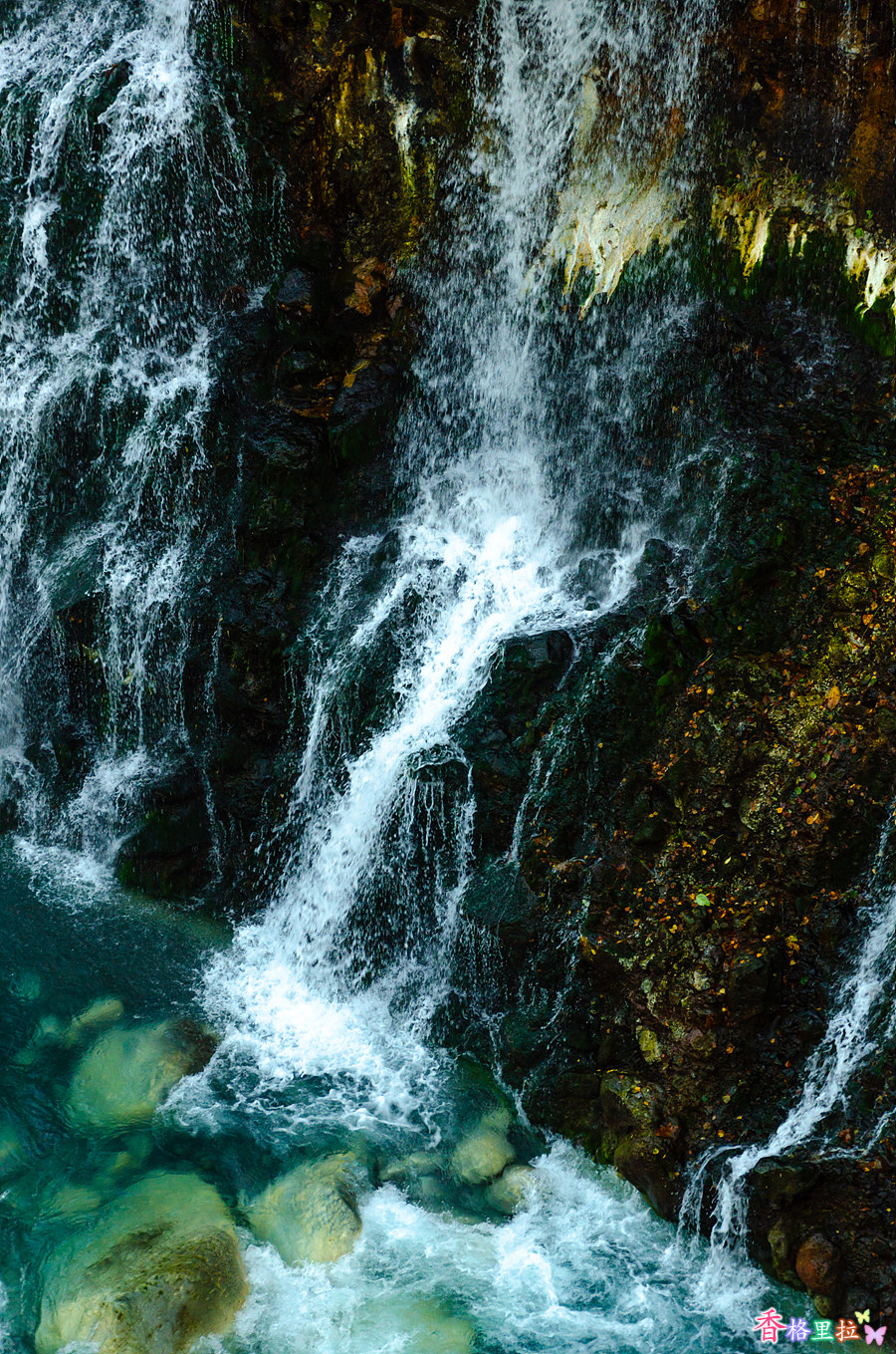 물이 석회 성분이 많아서 푸르스럼하게 보인다. 시라히게노다끼(しらひげの滝)는 겨울에도 폭포에서 흘러내리는 물이 얼지 않는다.