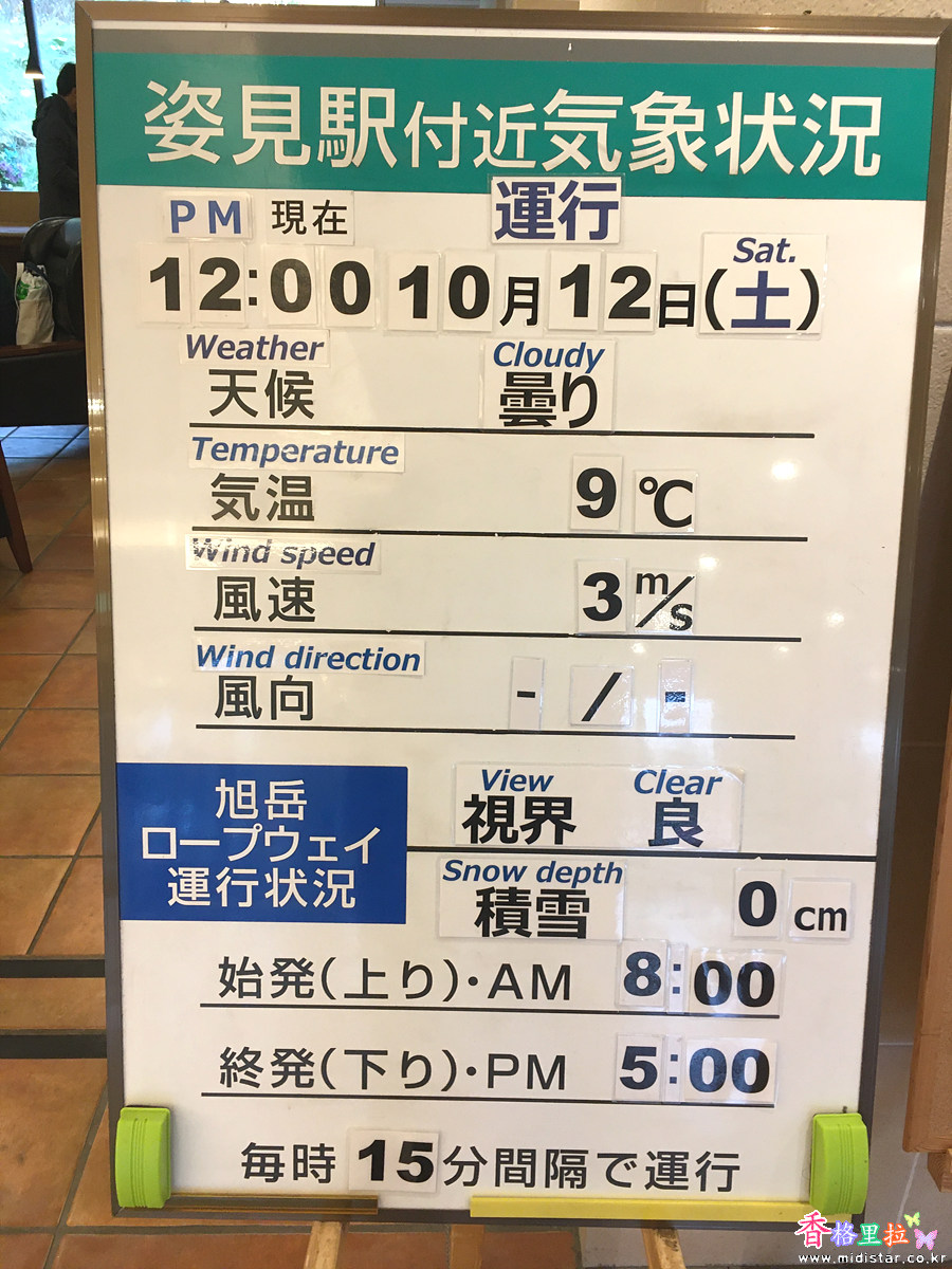 수카타미에키(姿見驛) 부근의 기상상황을 알려주는 로프웨이 운행 정보판이 있었다. 아침 8시에 첫차가 운행한다.