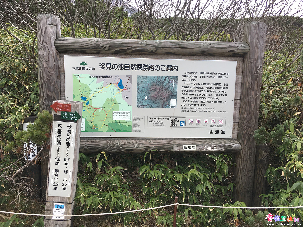 다이세스잔(大雪山) 아사히다케(旭岳) 주위를 도는 트레킹 코스는 5시간 정도 소요된다고 하는데 트레킹 하는 사람은 장부에 이름과 연락처를 남겨 놓고 가야 된다고 한다.