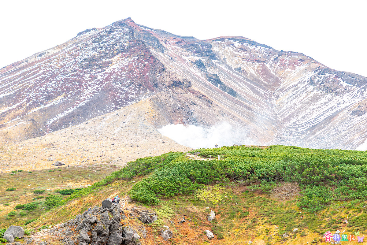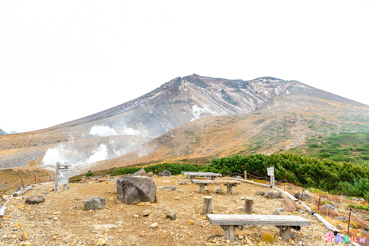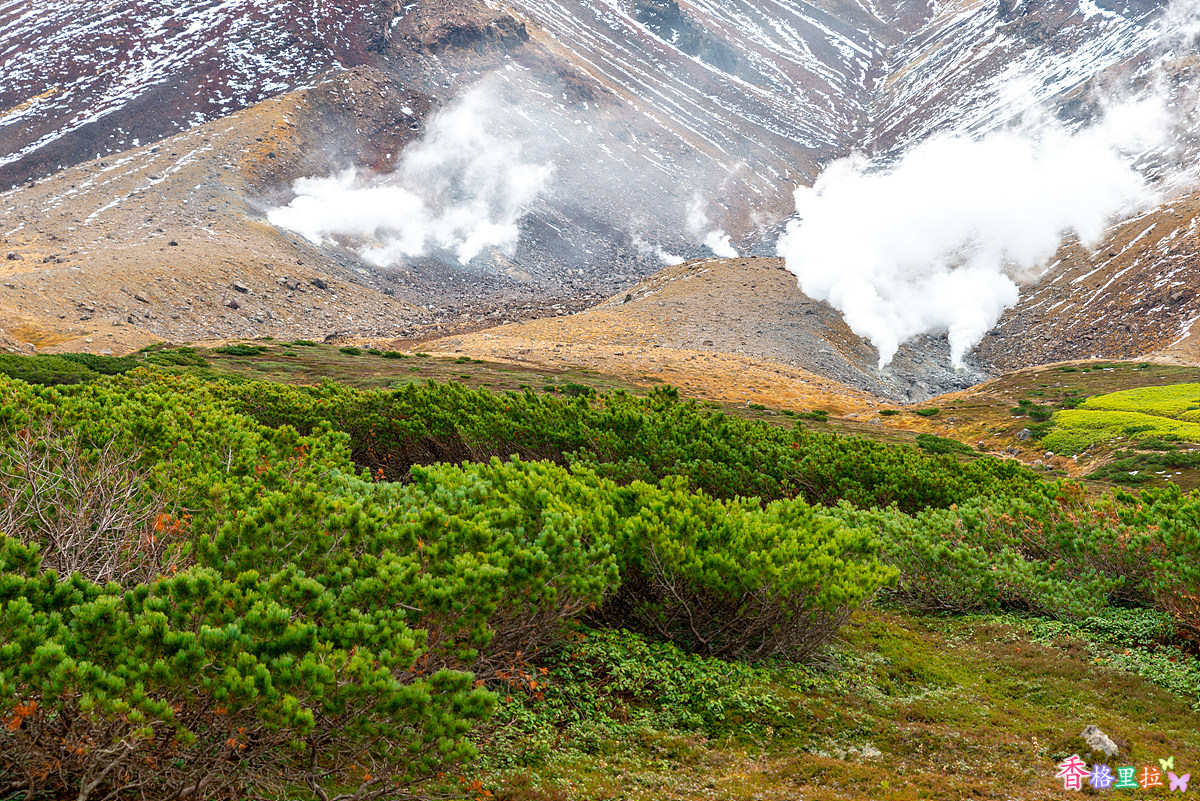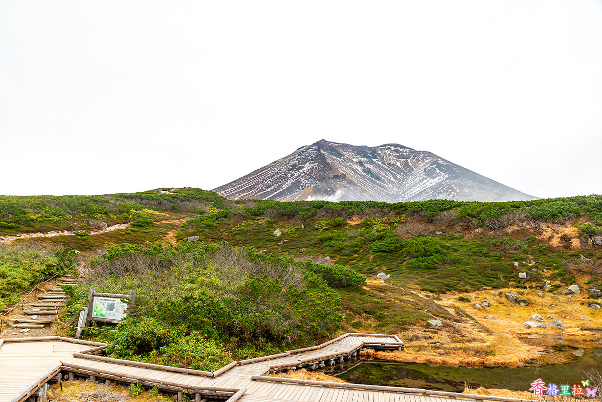 로프웨이 종점 수가타미(姿見) 역을 나서니 아사히다케(旭岳)가 눈앞에 펼쳐진다. 해발고도가 높아서 큰 나무들은 없다.