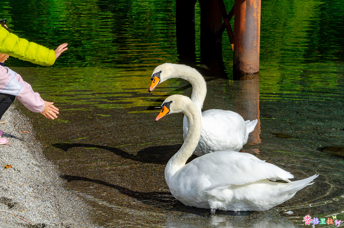 백조인지 오리인지? 몇 마리가 아이들의 관심을 끌고 있다.