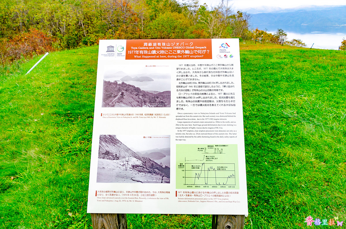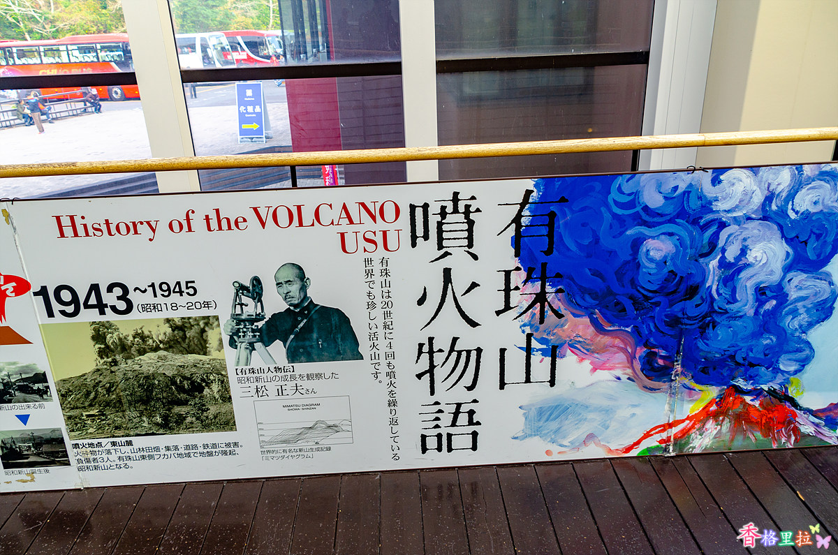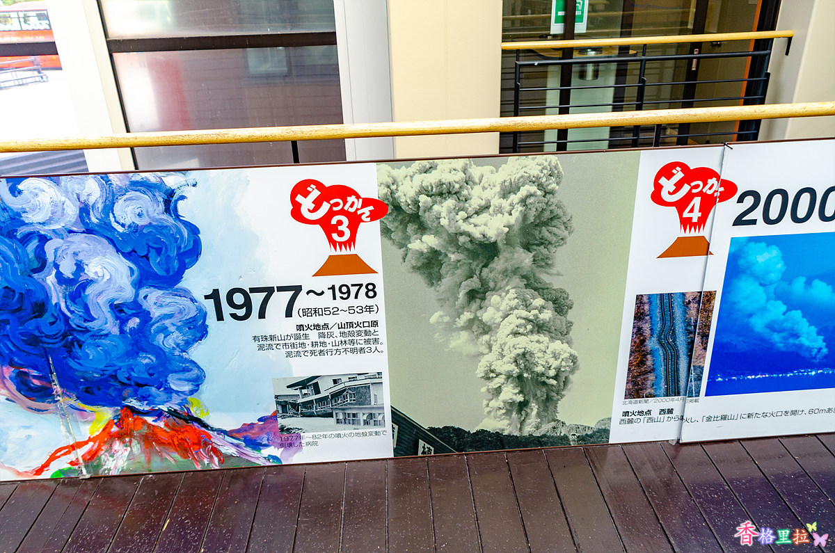20세기에 4번에 걸쳐 화산 폭발이 일어난 우수잔(有珠山) 화산 폭발 역사를 간략하게 보여주고 있다.