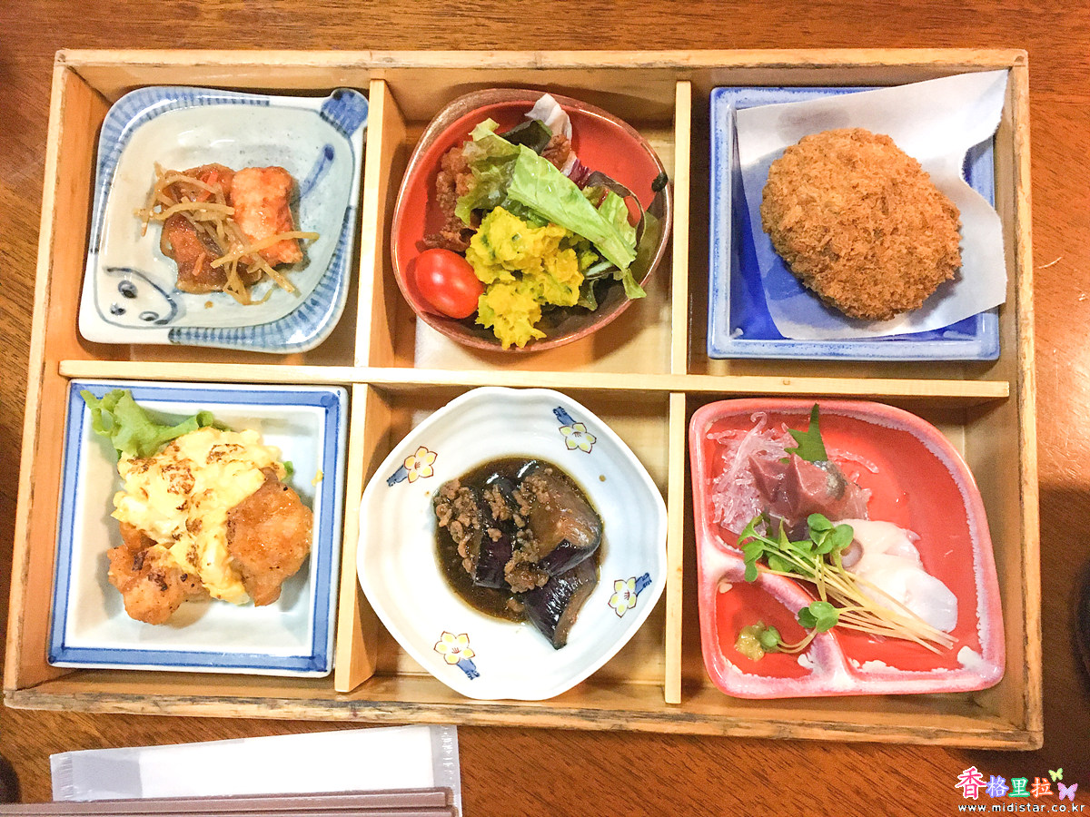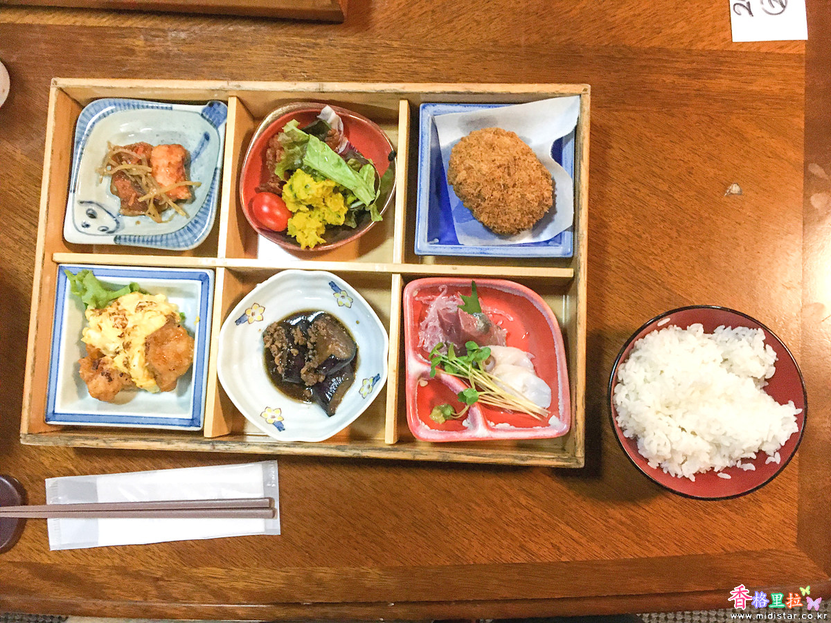 저녁 식사는 개인당 찬합 한통에 6가지 반찬을 제공한다.