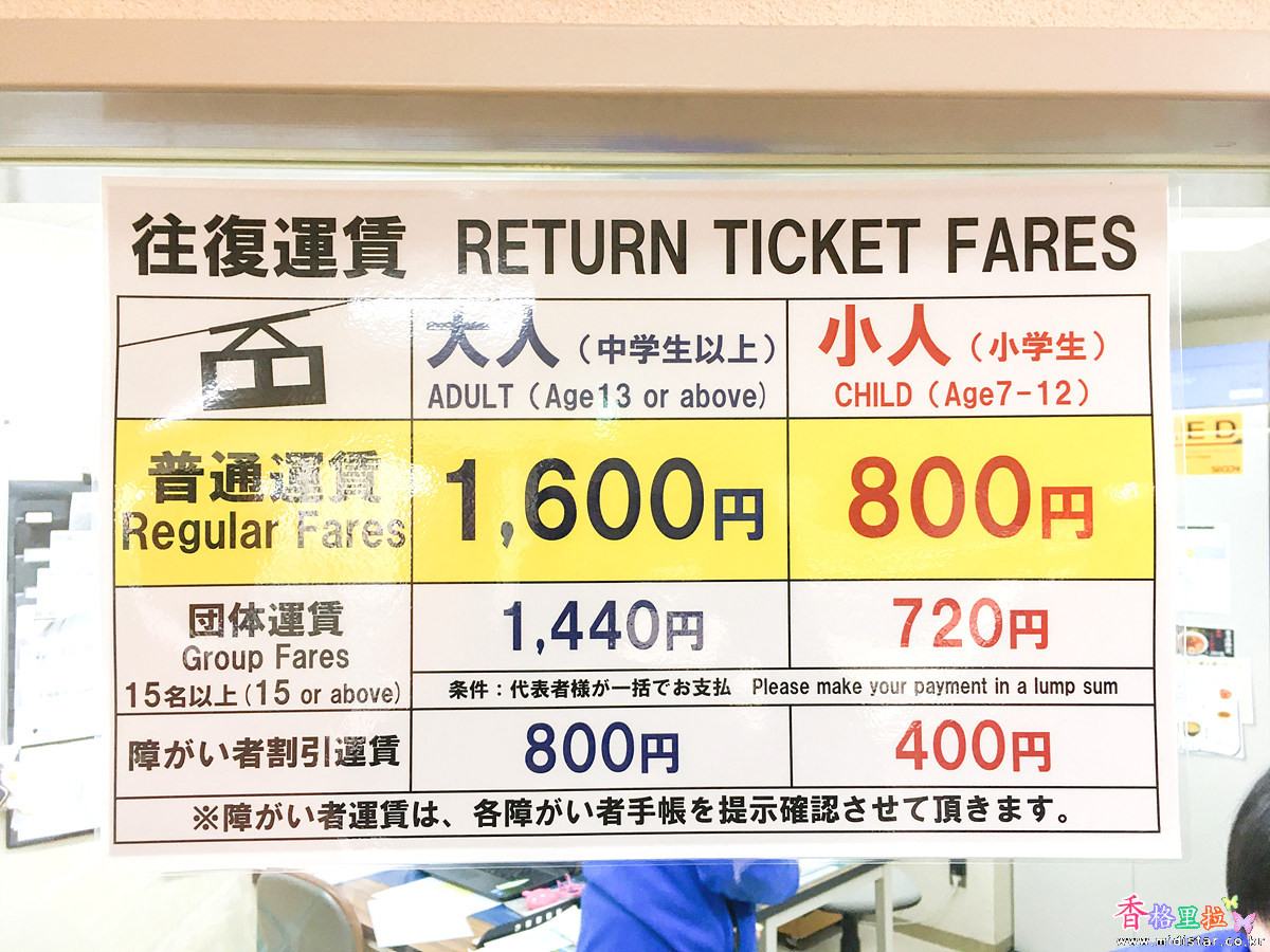 ▲우수잔(有珠山) 로프웨이 운임표