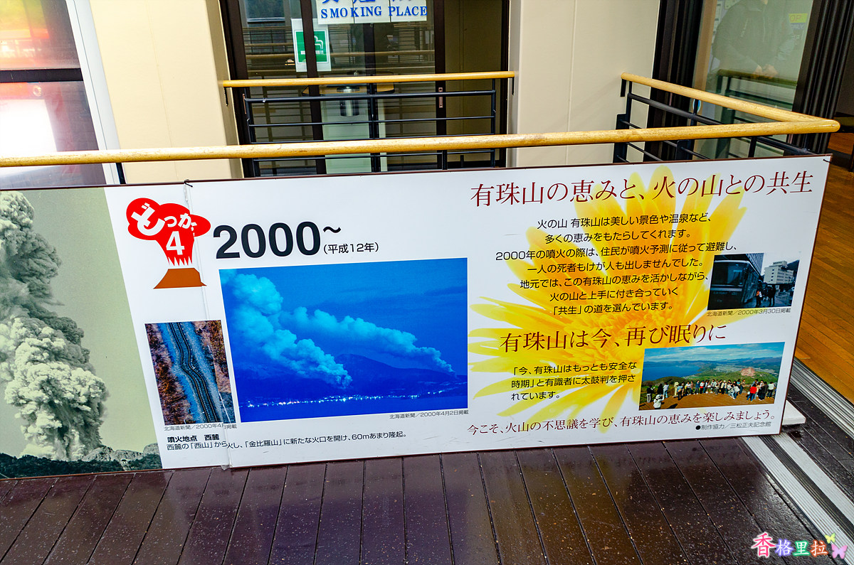 20세기에 4번에 걸쳐 화산 폭발이 일어난 우수잔(有珠山) 화산 폭발 역사를 간략하게 보여주고 있다.