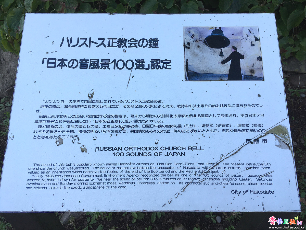 하리스토스 정교회(函館ハリストス正教会)의 종이 일본의 음풍경(音風景) 100선 인정을 받았다는 안내문이 있다. 소리가 좋은 음풍경(音風景)이라는 것도 있는 일본이다.