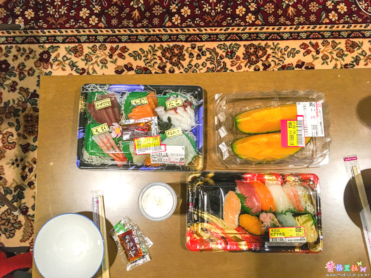 마트에서 사온 저녁거리를 펼쳐놓고 사케 한잔 마시며 여행의 피로를 푼다