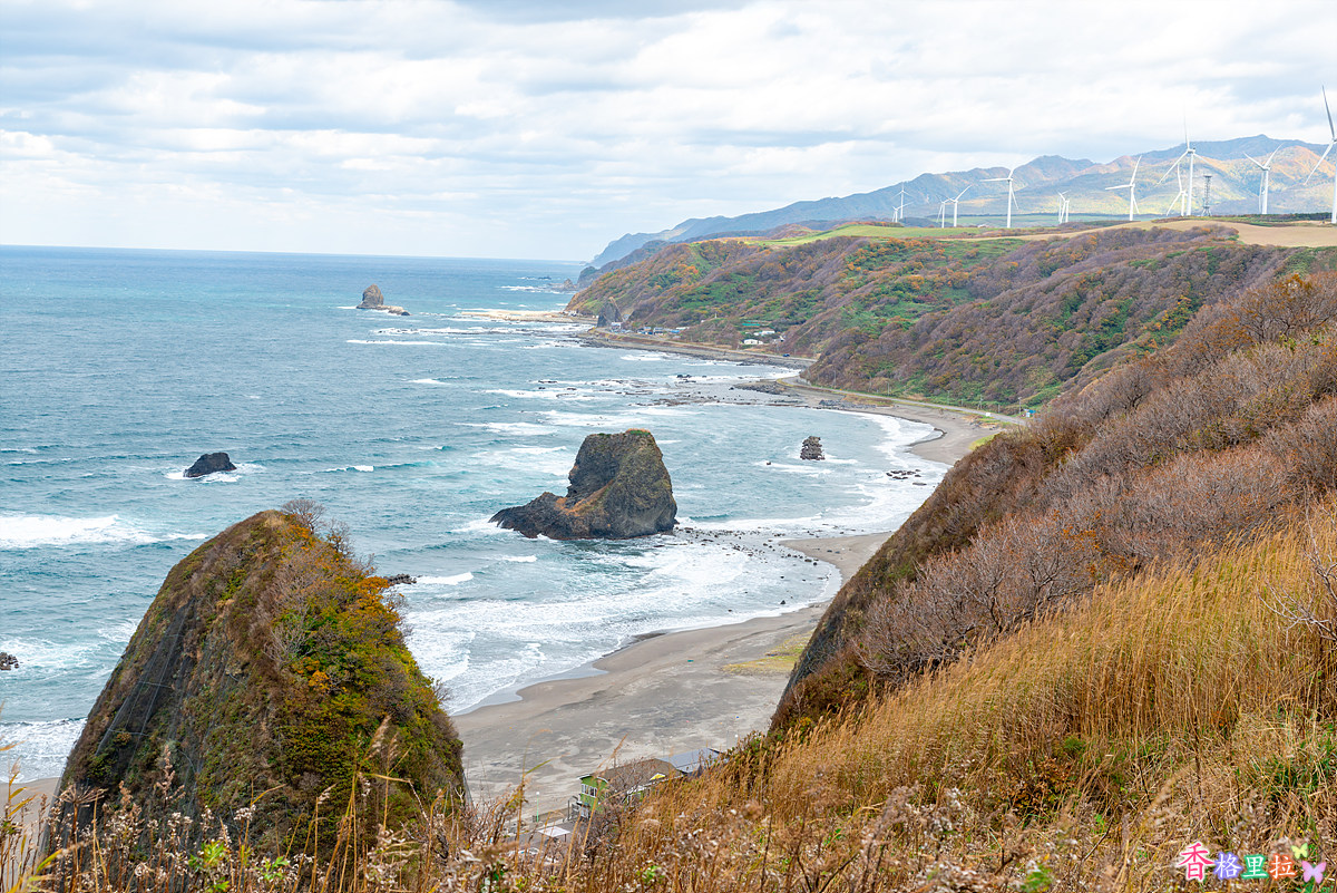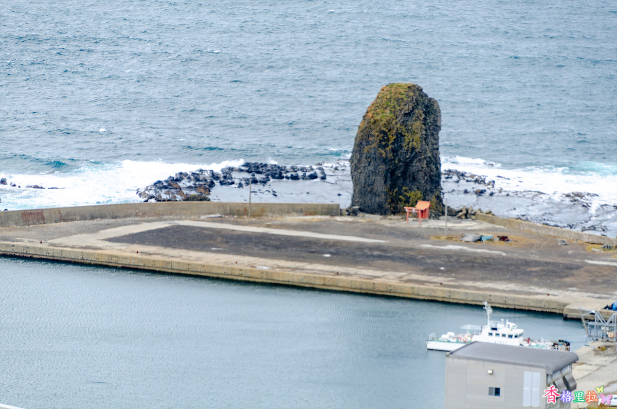 산본스기이와(三本杉岩)가 있는 바닷가를 내려다 볼 수 있는 중간 목적지 리쇼잔(立象山) 전망대(展望台)가 마을 뒷쪽 절벽위에 보인다.