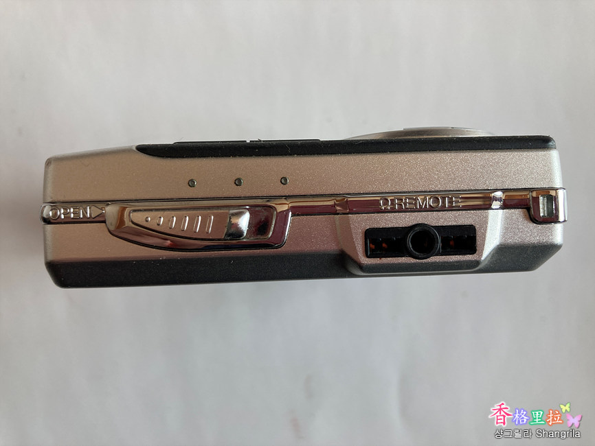 왼쪽에 Mini Disc 를 넣고 뺄 때 커버를 여는(Open) 스위치(Switch)와 리모컨과 이어폰을 연결하는 단자가 있다.