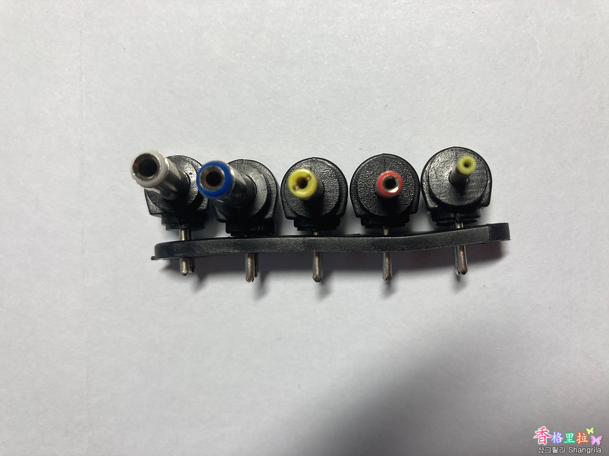 왼쪽부터 5.5x2.5mm, 5.5x2.1mm, 4x1.7mm, 3.5x1.4mm, 2.5x0.7mm 규격의 Plug 부속품이다. 앞 자리 숫자가 외경, 뒷자리 숫자가 내경이다.