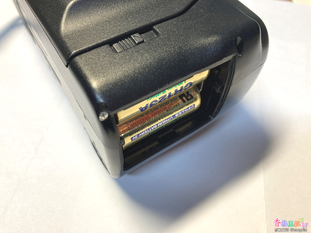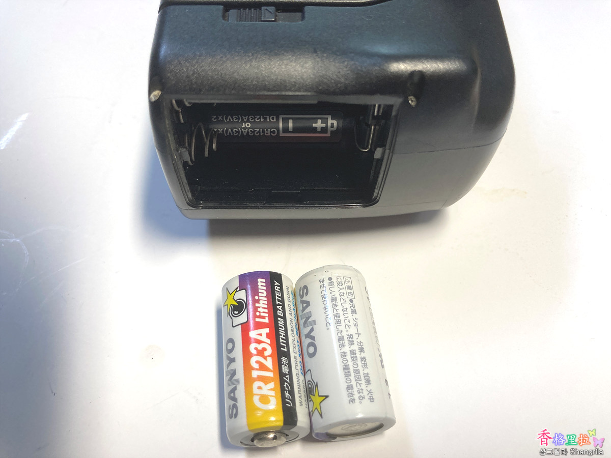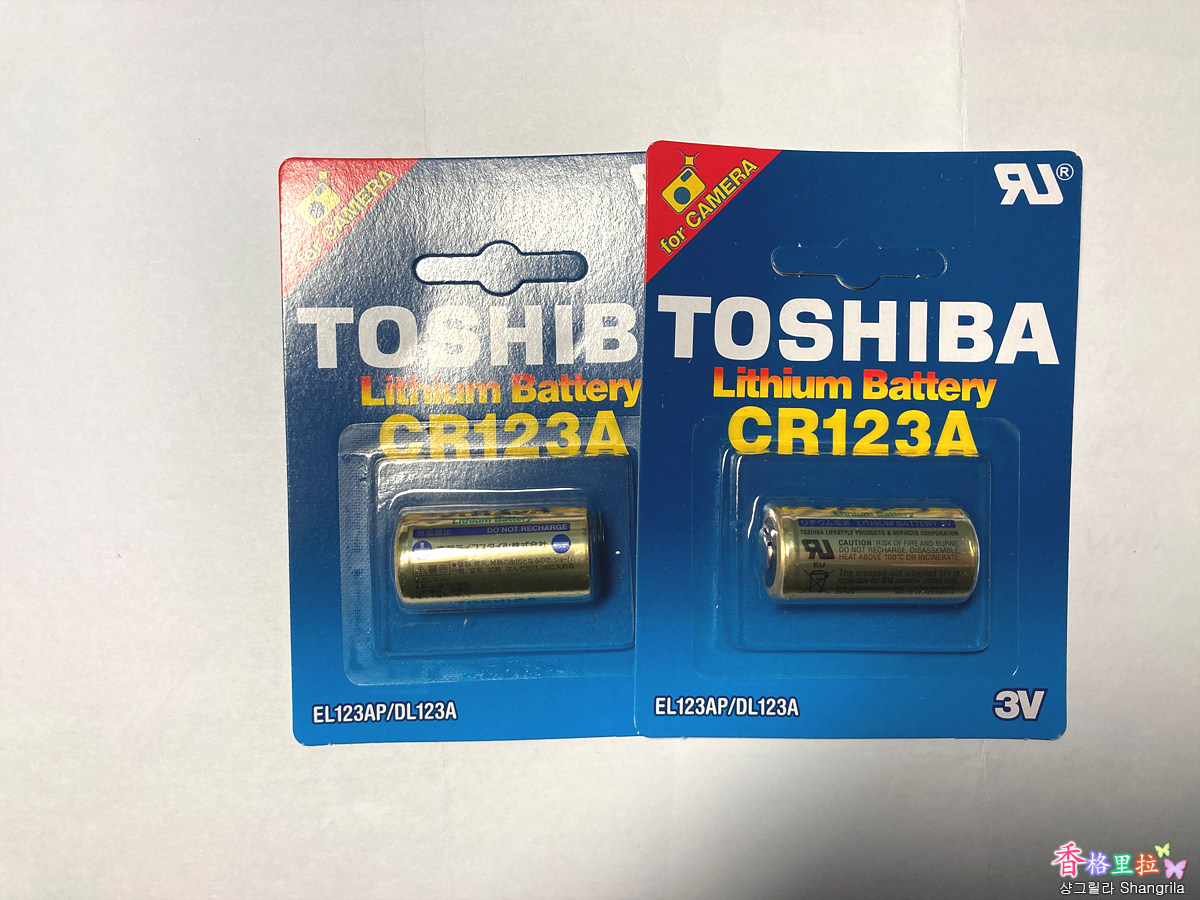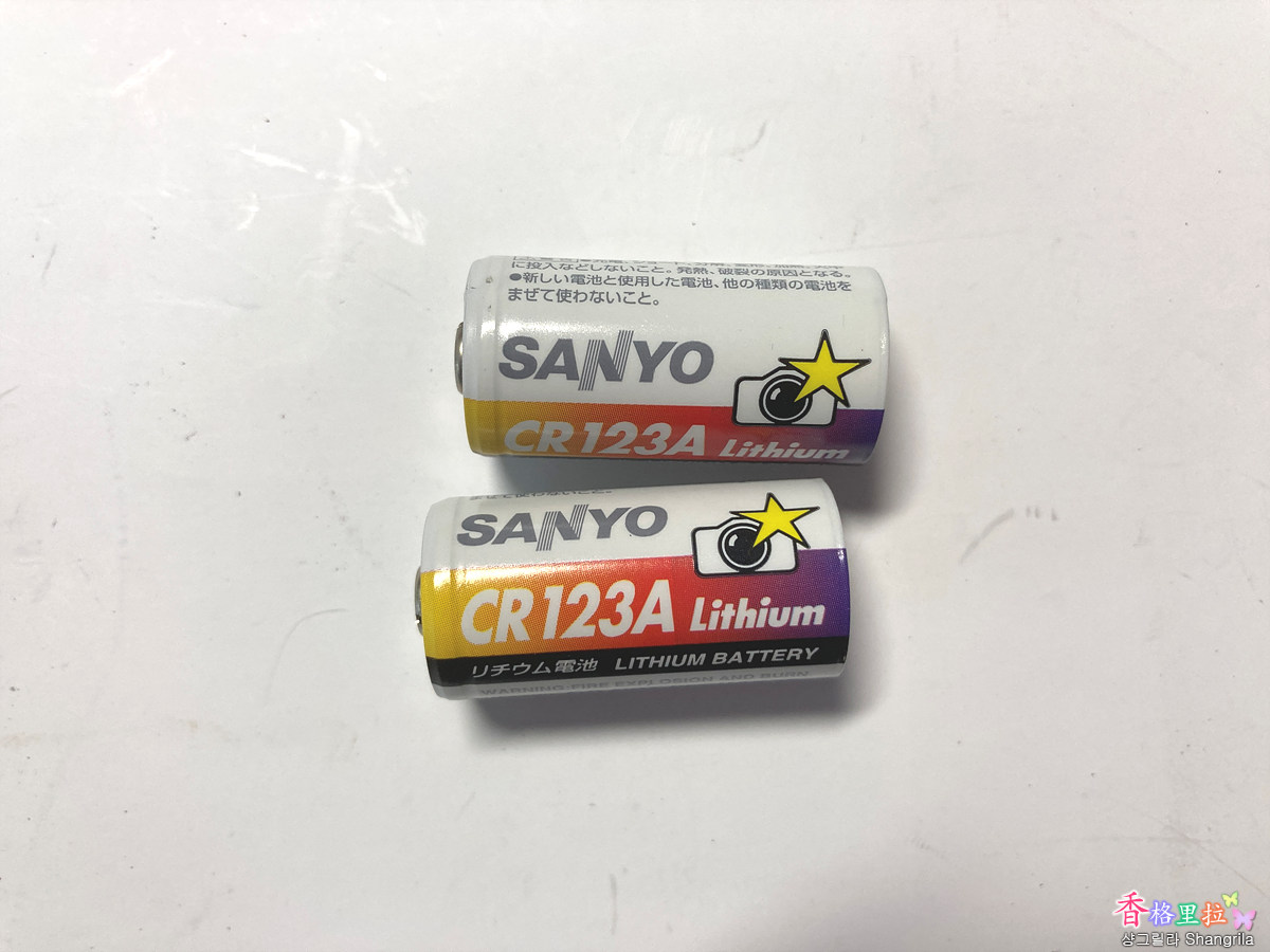 산요(Sanyo) CR123A 3V BAttery가 두 개 소요된다.