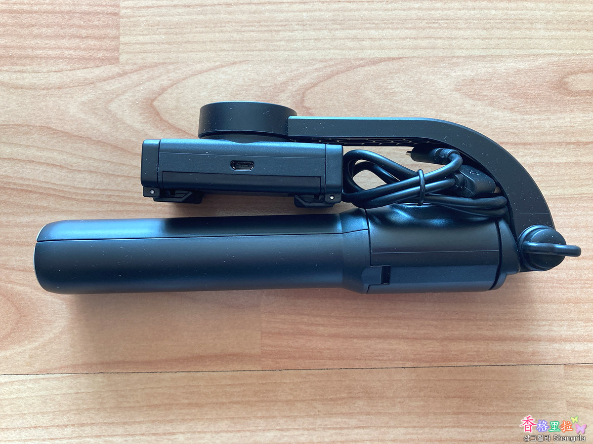 Nutz NZ-01 짐벌 Unit에 USB 충전 포트가 보이고 USB 충전 케이블이 들어있다. 배터리 유지 시간이 3시간 정도 되는 것 같은데 너무 조루인 것 같다. 여행을 하면서 3시간 이상 촬영을 할 경우가 많은데... 아쉽다.