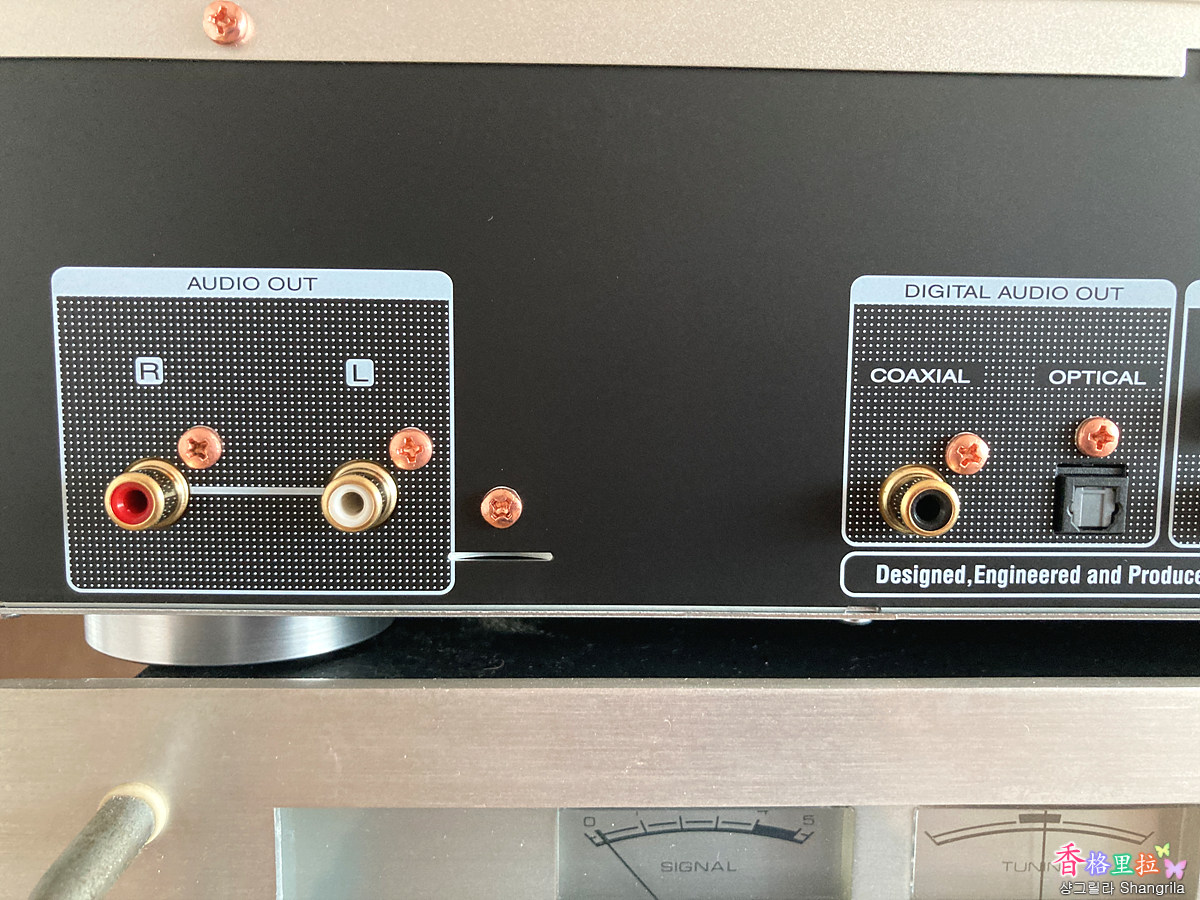 왼쪽에 AMP로 가는 RCA 출력 단자가 있고 Dgital 출력 단자 동축(Coaxial)과 광(Optical) 단자가 있다,