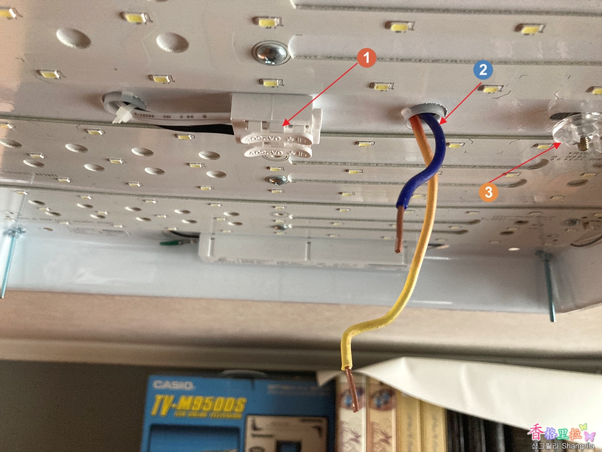 가운데 있는 하얀색 컨넥터(1)에서 등기구의 메인전선(2)을  뗴어낸다. 뻰찌등으로 잡고 힘주어서 빼내야 한다.