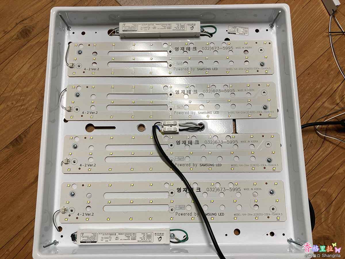 LED 기판 4개를 부착하고 기존 컨버터를 부착한 후 전원 컨넥터에 임시로 콘센트의 전선(검정색)을 물려서 테스트할 준비를 마쳤다.