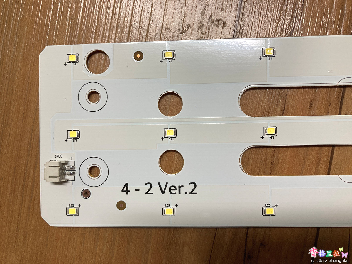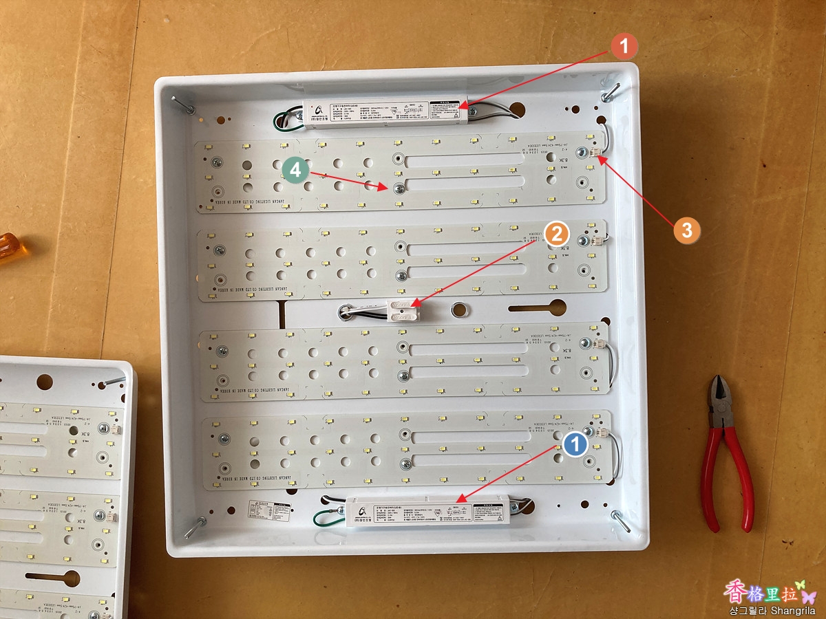 작은 방의 양호한 LED 기판(4) 2개를 떼어내서(나사 3개를 풀면 됨) 안방의 불량 LED 기판을 떼어낸 자리에 부착하고 테스트를 해보니 컨버터(1)가 불량이 아니라 LED 기판이 불량이다. LED 기판 컨넥터(3)를 뺄때는 니퍼등으로 끝을 잡고 조심 스럽게 빼내야 한다.