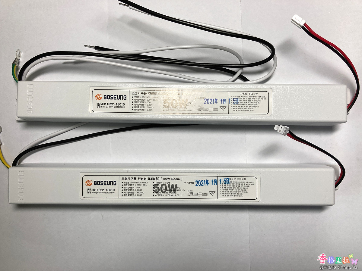 그래서 지난번 부억 LED 등기구가 번쩍 번쩍거리며 불이 겨우 겨우 들어오는 고장 현상이 발생했을 때 내부를 열어 보고 보승전기라는 회사를 검색, 사진을 보내주고 컨버터만 구입, 교체해서 수리하였기에 이번에도 같은 회사 등기구인줄 알고 지난번의 회사(보승전기)에 컨버터 2개를 주문해서 택배롤 받았다.