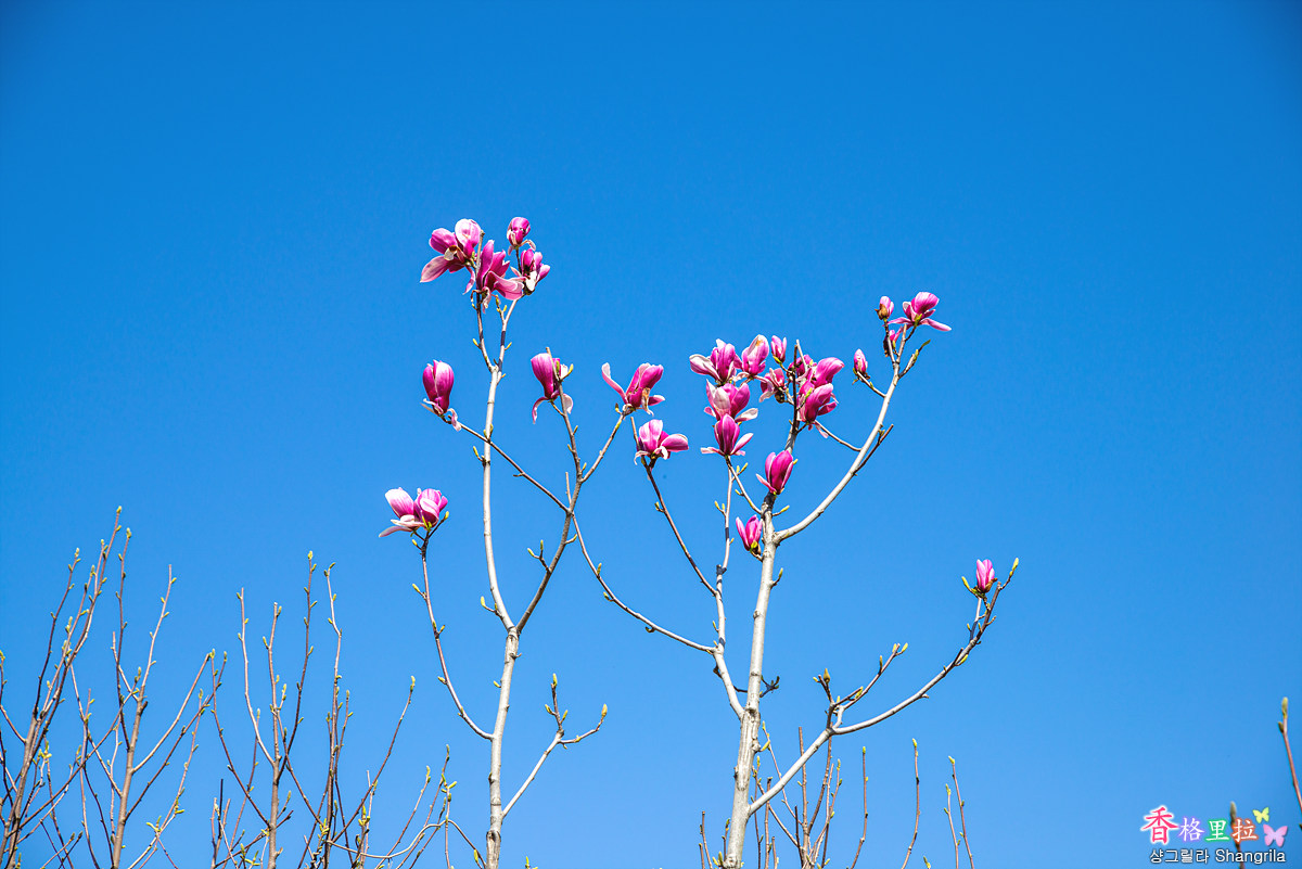 파란하늘을 배경으로 자목련이 청초해보인다.