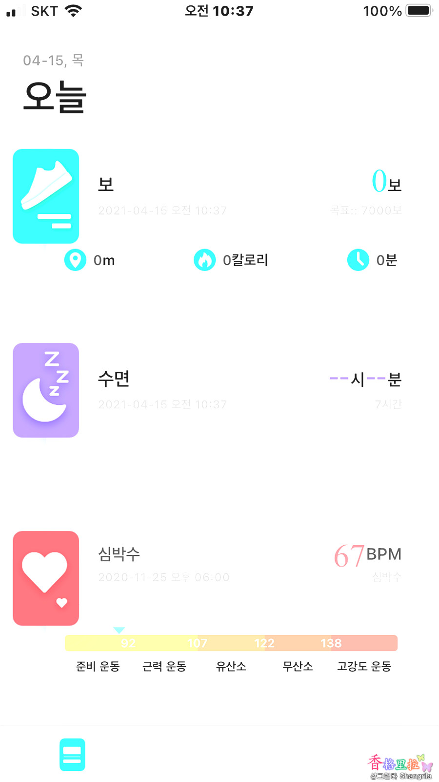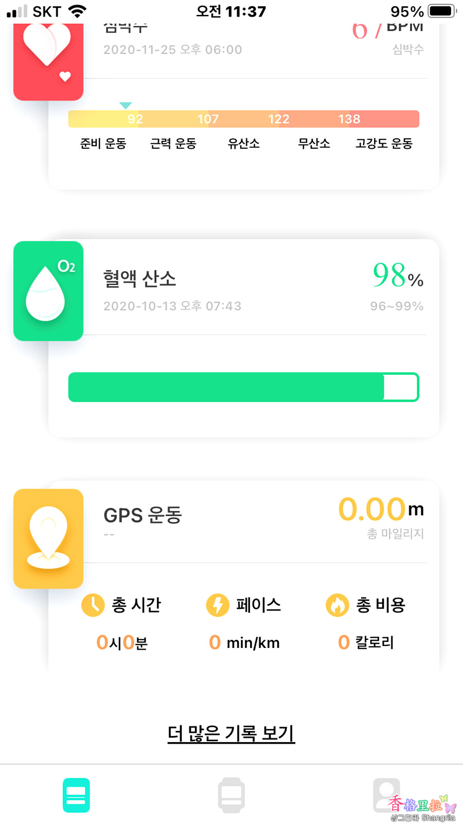 다시 아래의 3개 아이콘 중 첫 번째 아이콘을 누르면 아래와 같이 오늘의 운동량 보, 수면, 심박수, 혈액 산소, GPS 운동 등을 보여준다.
