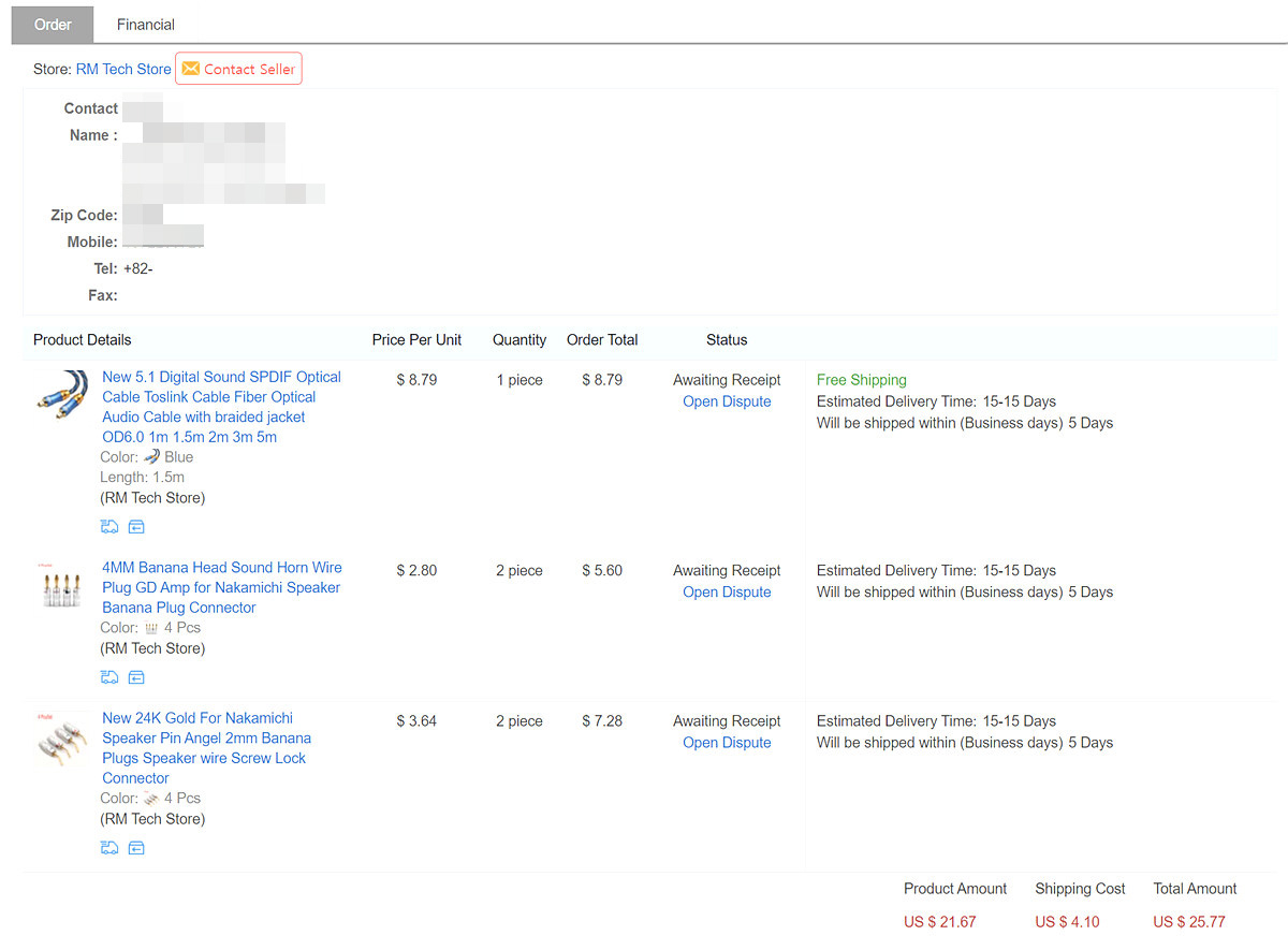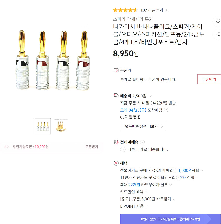 지난번에 Ali에서 싸구려 TV용 DAC를 직구로 구입해서 별 탈 없이 물건을 받았기에 이번에는 좀 더 안심(?)하고 주문을 하면서 Speaker 바나나 단자를 같이 주문했다.