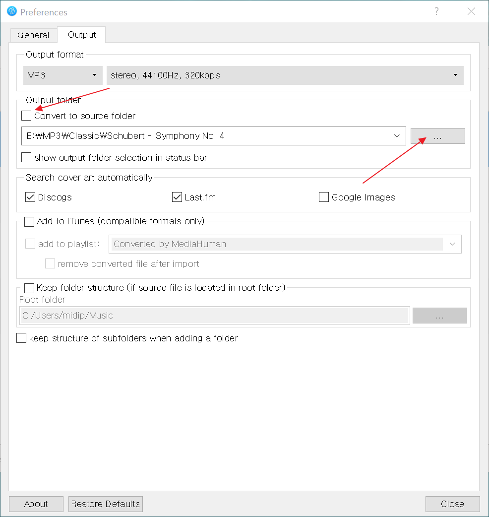 Output folder 항목에서 Converter to source folder에 체크하면 FLAC File이 있는 같은 폴더에 mp3를 변환하여 저장한다.