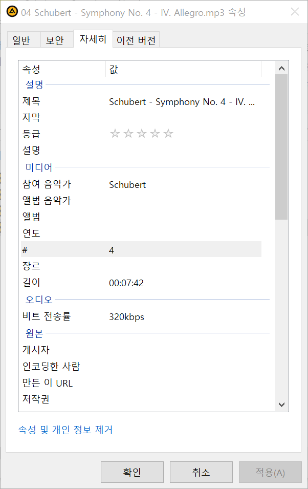 속성을 확인해 보면 비트전송률이 320 kbps 인 것을 알 수 있다.