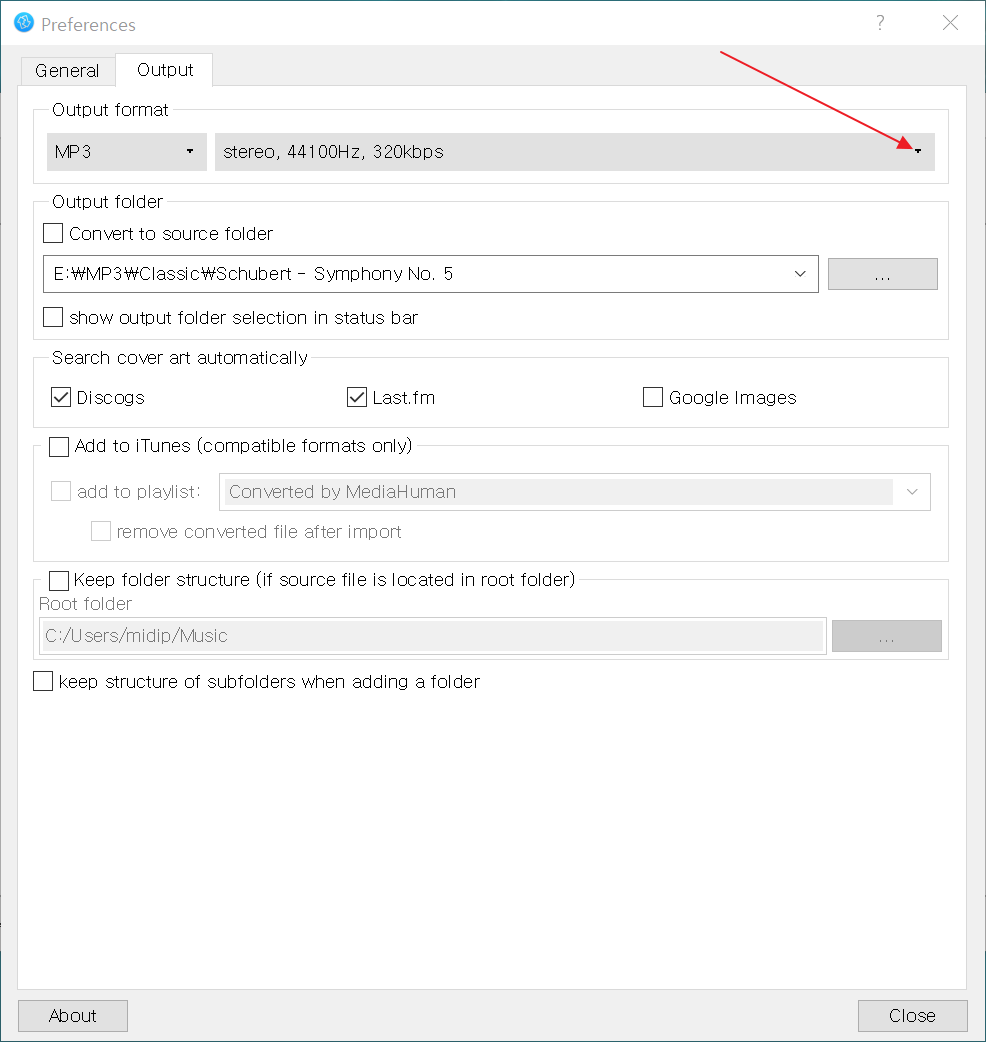 Preferences에서 Output을 선택 후 왼쪽의 선택버튼을 눌러 MP3를 선택, 오른쪽의 메뉴 중에서 stereo, 44100Hz, 320 kbps를 선택해 준다.