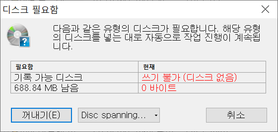 공 CD를 CD Rom에 넣지 않거나 CD Rom Driver 선택이 잘못되어 있으면 위와 같은 화면이 나온다. 취소를 눌러서 전 화면으로 돌아간다.