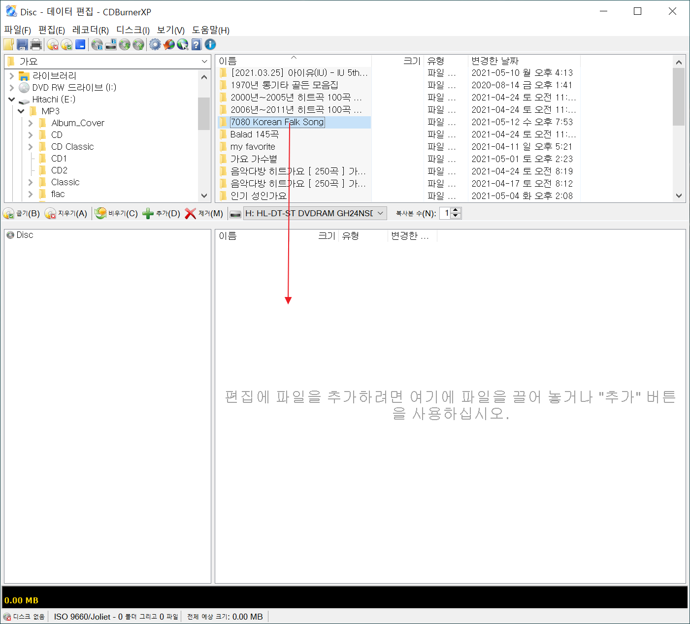 CD에 구입하려는 폴더를 선택해서 드래그해서 아래쪽 창으로 끌어서 드롭해 준다.