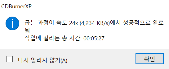 디스크 굽기 화면이 나오는데 굽기 속도를 지정해 줄 수 있으며 24x로 지정해 주면 무리 없이 굽기를 할 수 있다.