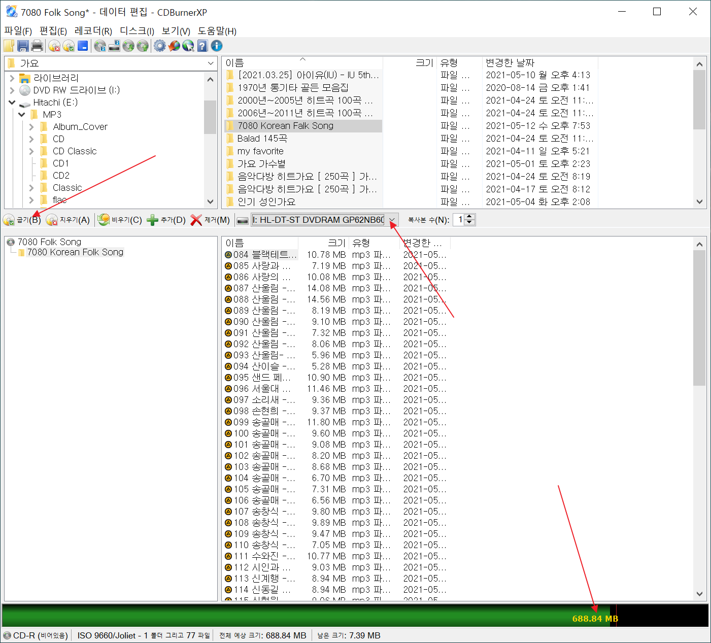 CD 용량에 맞게 곡목을 선택해서 추가하거나 제거해 주어 CD 용량 700MB 이하로 조절해 준다.