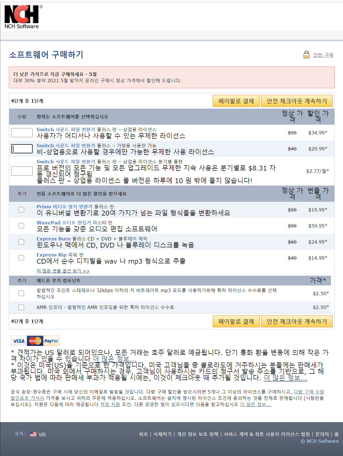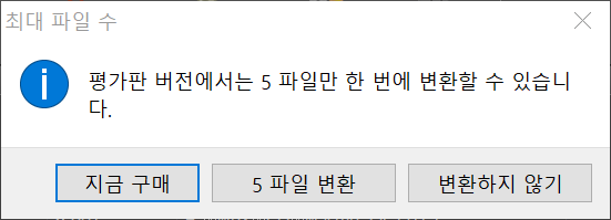 Switch 사운드 파일변환기는 비상업 가정용으로는 프리로 사용할 수 있는 제품인데 평가판은 한번에 5개 파일만 변환 할 수 있다. 그리고 일정 횟수 이상 변환작업을 하려하면 구매하라는 메세지가 계속 나온다.