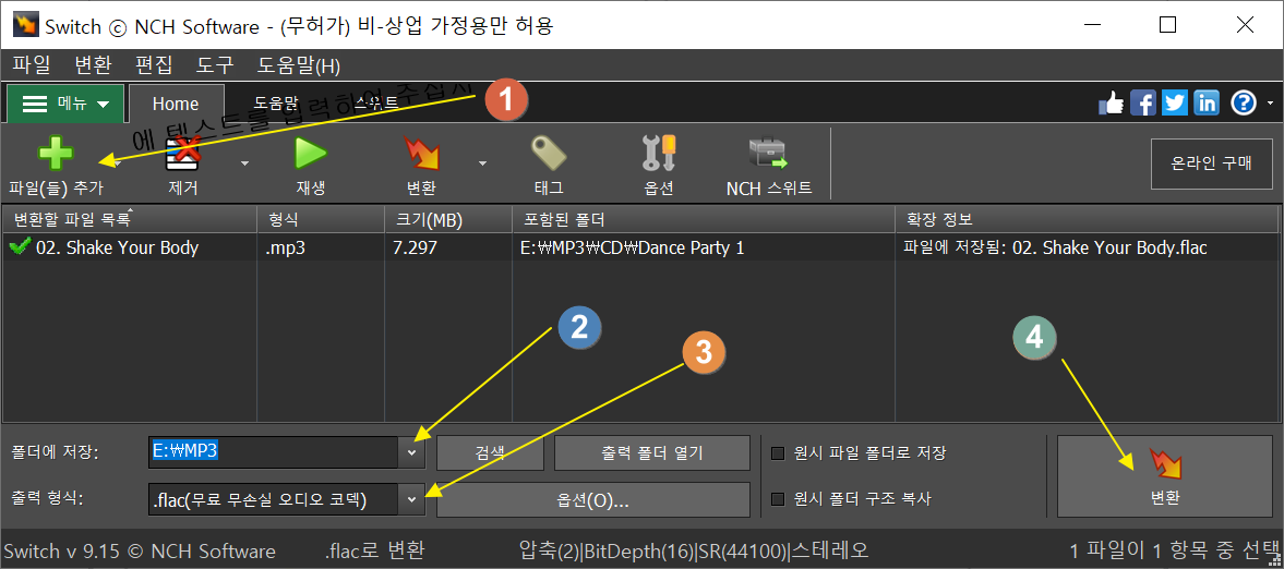 옵션 선택에서 MP3를 FLAC으로 변경 설정해주면 된다.