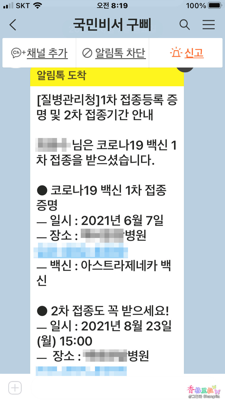 다음 접종일은 8월 23일 같은 같은 병원, 같은 시간에 접종받으라는 안내 카톡이 왔다.