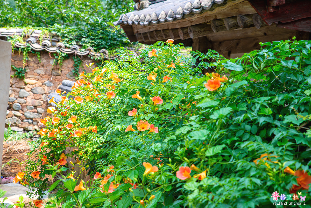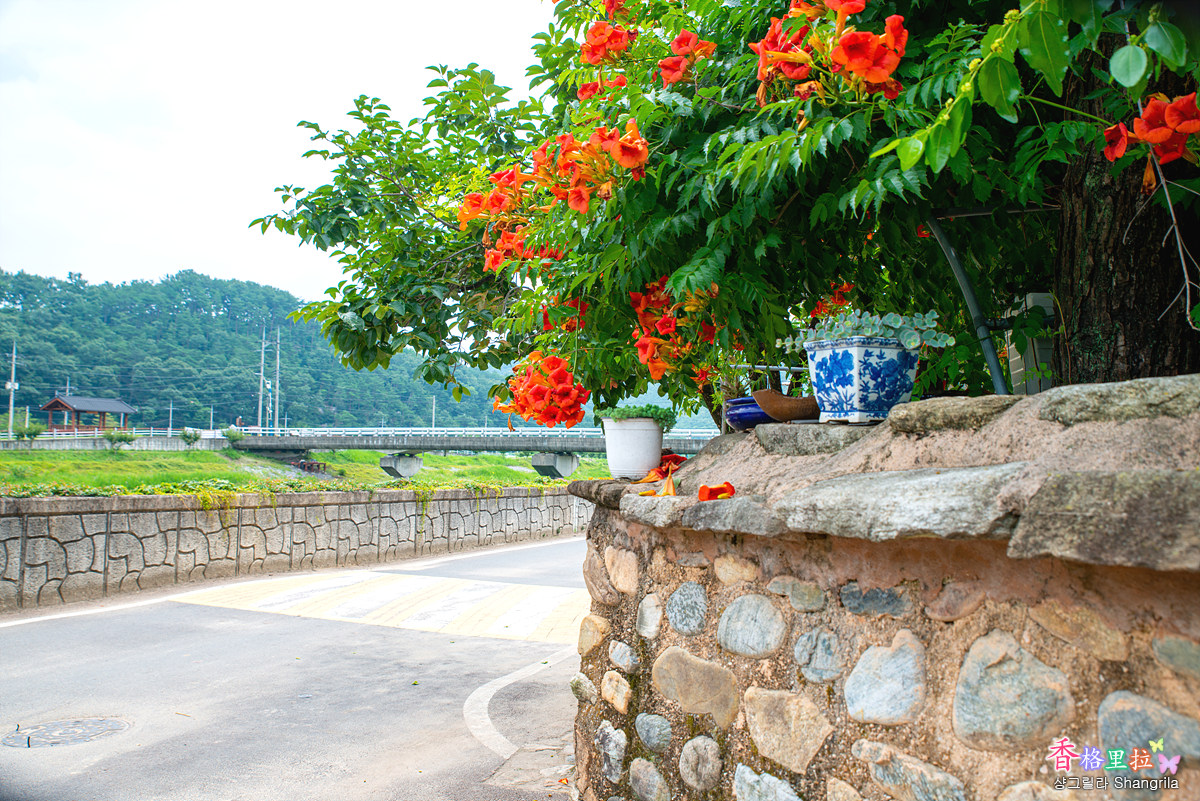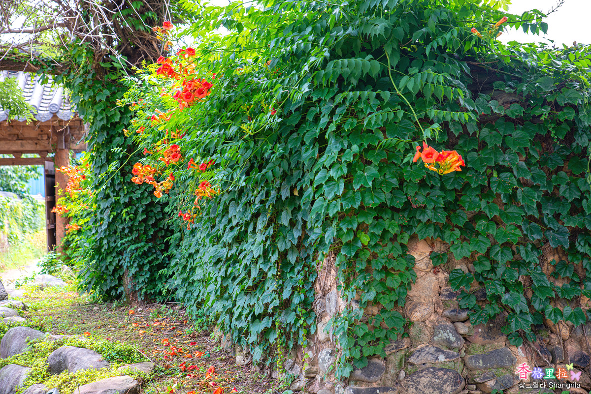 능소화가 한참인 담벼락 위에 예쁜 화분 몇 개가 놓여 있다. 주인장의 따뜻한 마음을 읽을 수 있었다.