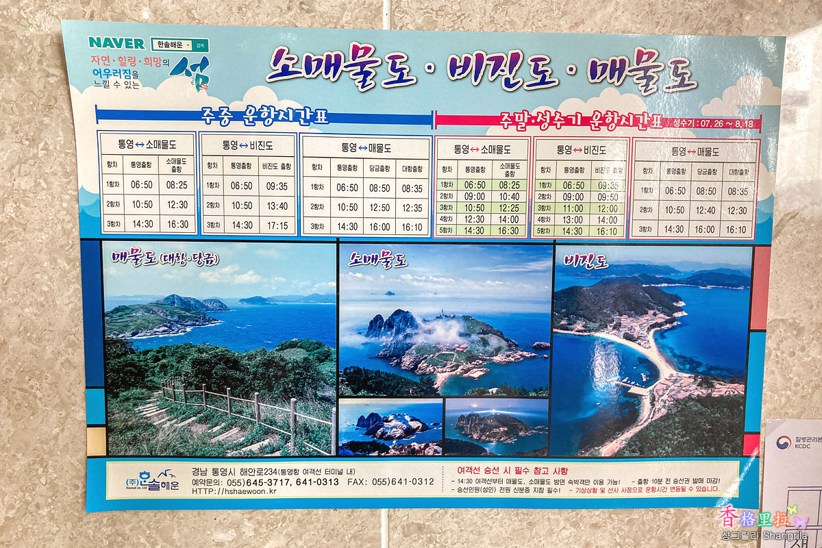 호텔 벽에 붙여놓은 매물도 배편 정보.