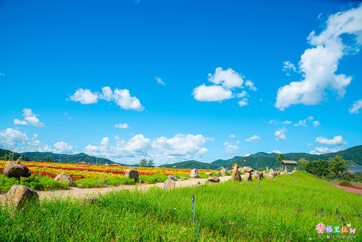 파란 하늘에 흰구름 두둥실 떠있는 아래쪽 들판에 노랑 빨강의 원색이 더해 더할 나위 없이 멋진 풍경이 펼쳐진다.