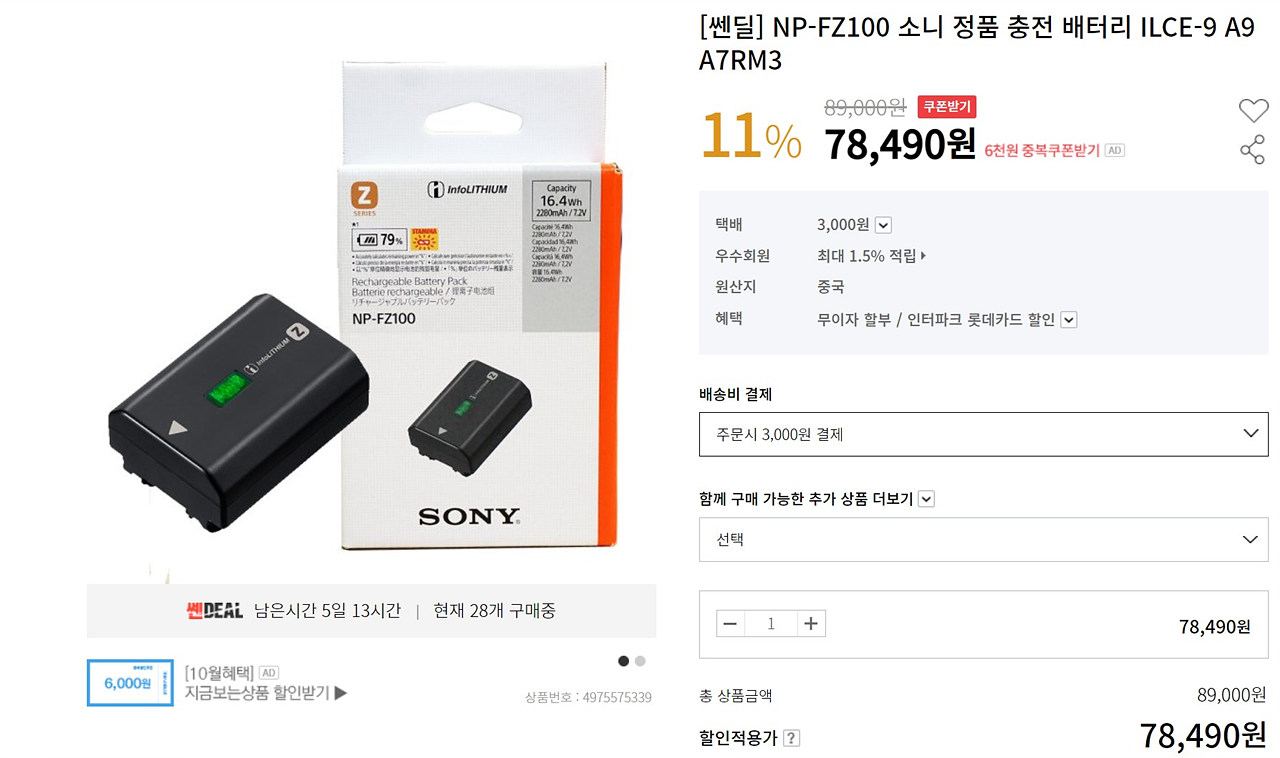 ▲Sony A7C용 NP-FZ100 정품 배터리 가격