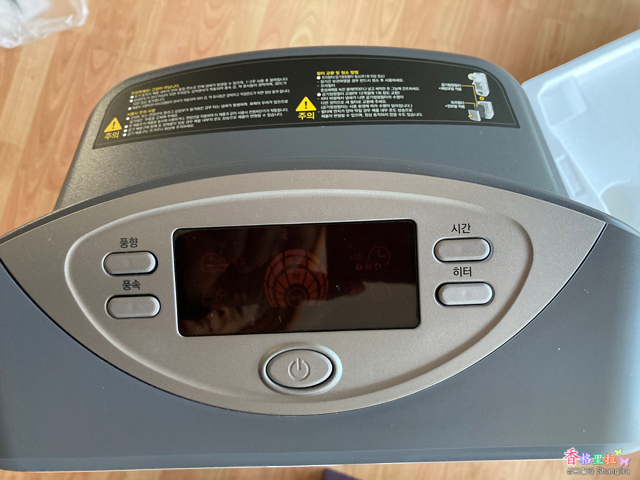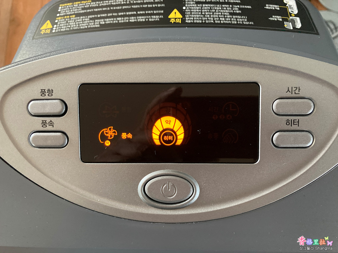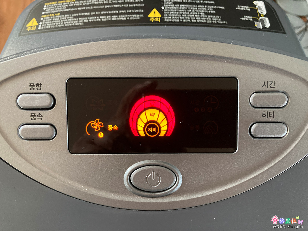 조작 판넬은 간단하다. 풍향, 풍속, 시간, 히터 그리고 전원 스위치가 있는데 조금 아쉬운 점은 히터의 조절이 강, 약 2단계밖에 없는 점이다. 중간 단계가 있었으면 좋았을 것 같다.